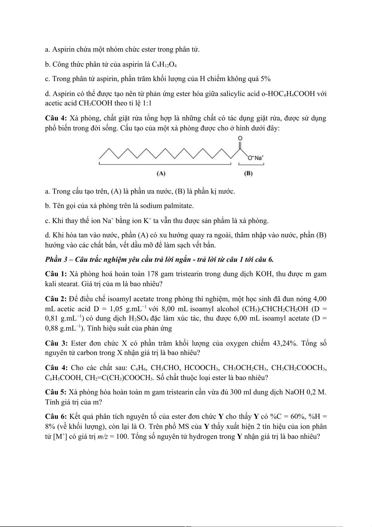 Câu 3: Ester đơn chức X có phần trăm khối lượng của oxygen chiếm 43,24%. Tổng số