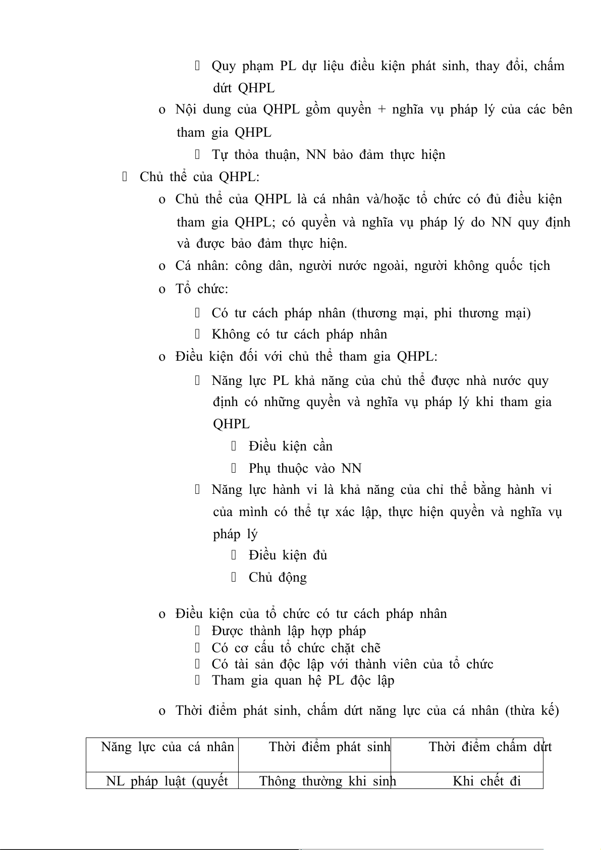 o Thời điểm phát sinh, chấm dứt năng lực của cá nhân (thừa kế) Năng lực của cá nhân Thời điểm phát sinh Thời điểm chấm dứt NL pháp luật (quyết Thông thường khi sinh Khi chết đi định) ra (trừ thai nhi) hoặc khi