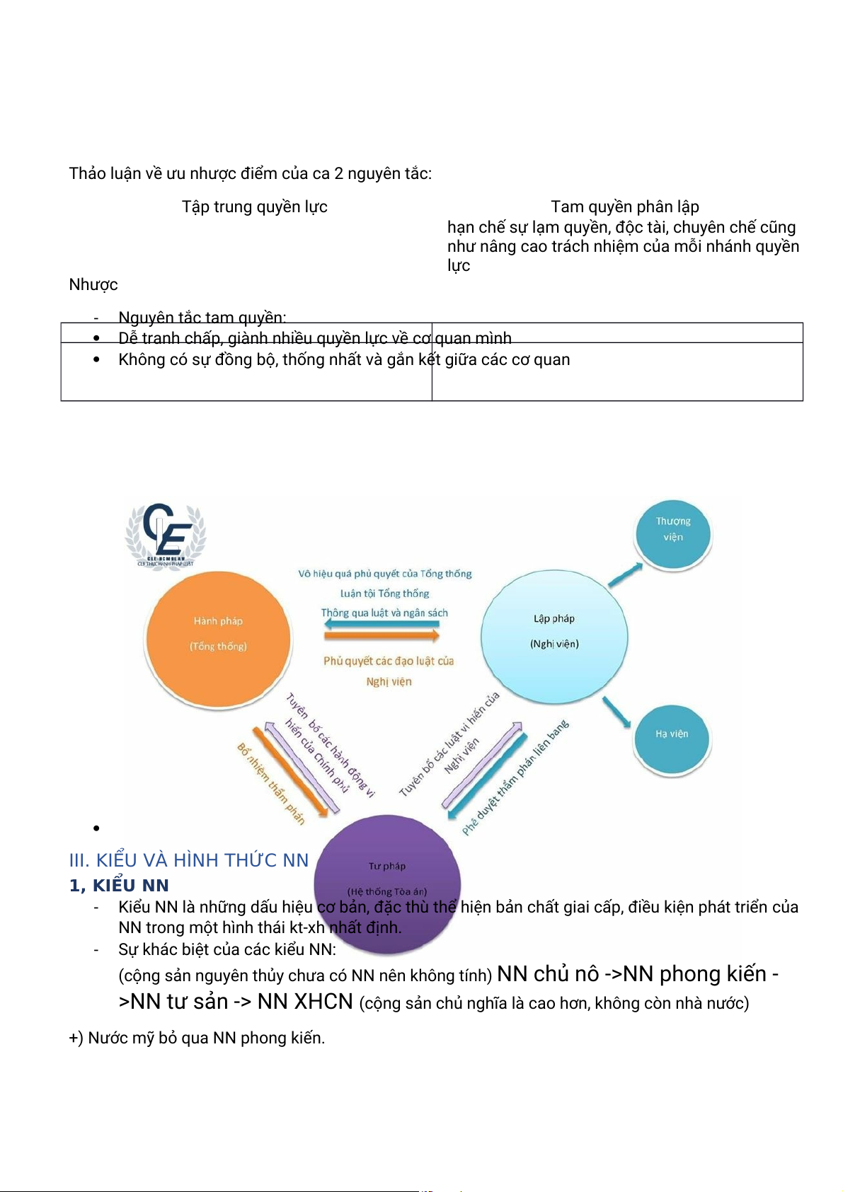 Thảo luận về ưu nhược điểm của ca 2 nguyên tắc: Tập trung quyền lực Tam quyền phân lập