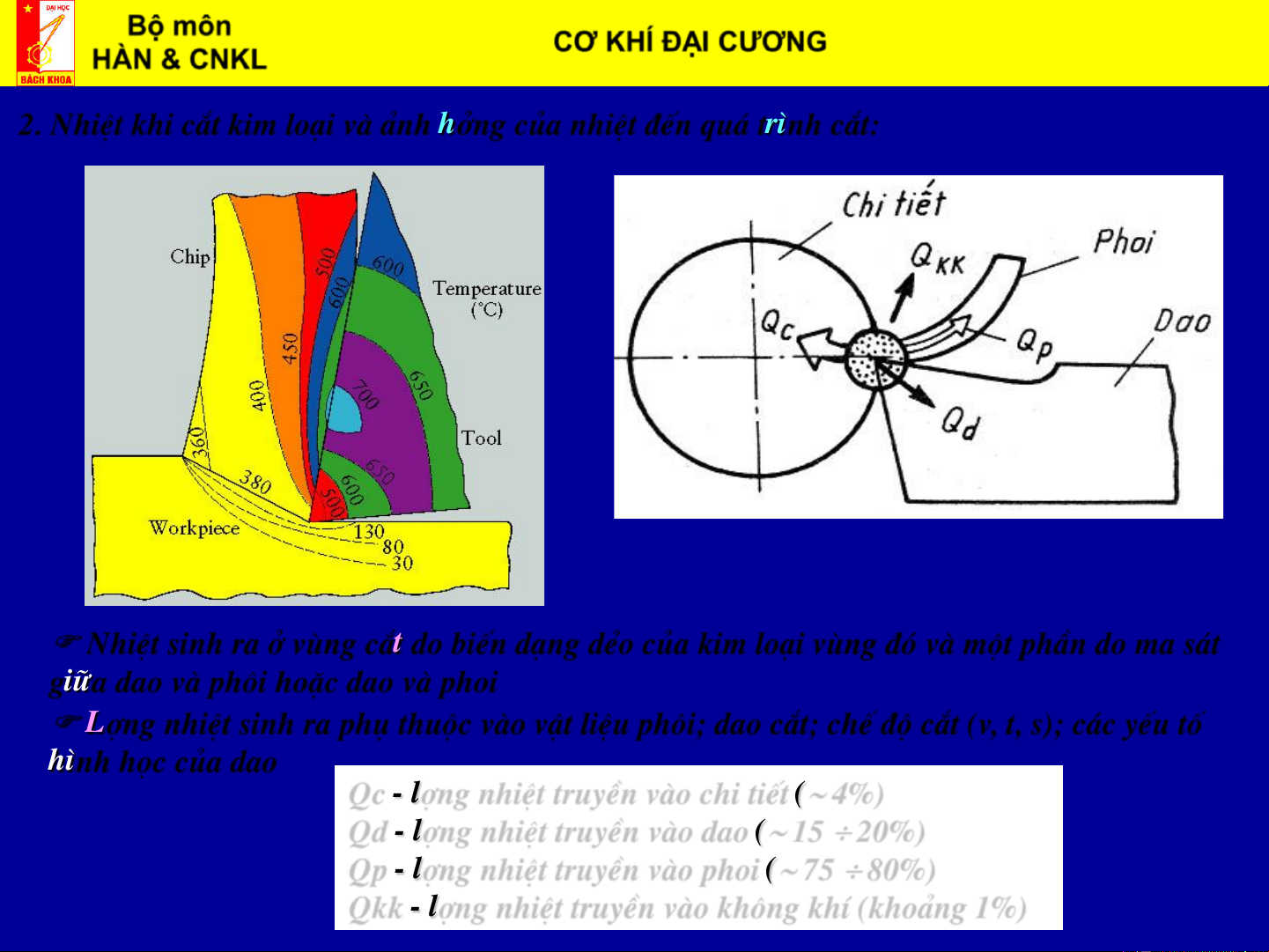 2. NhiÖt khi c¾t kim lo¹i vµ ¶nh hëng cña nhiÖt ®Õn qu¸ tr×nh c¾t: Q = Qc + Qp + Qd + Qkk
