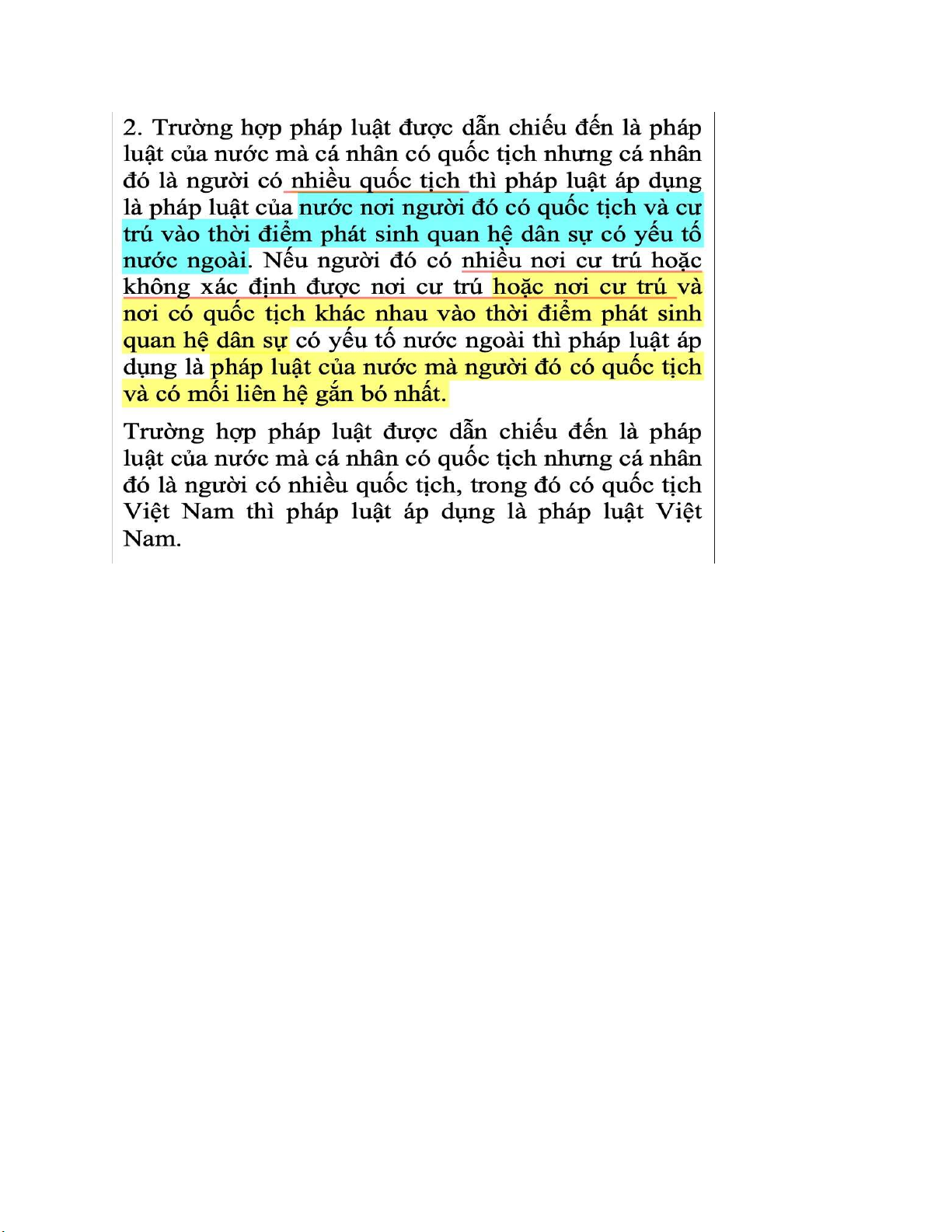 định theo luật nơi cư trú o Nhiều quốc tịch, cư trú 1 nơi => theo luật nơi người cư trú Luật dân sự 2015