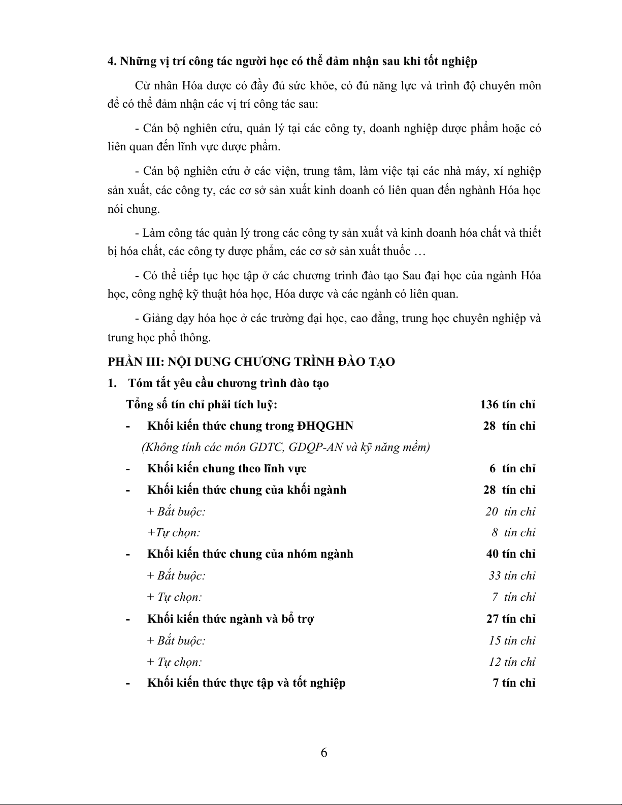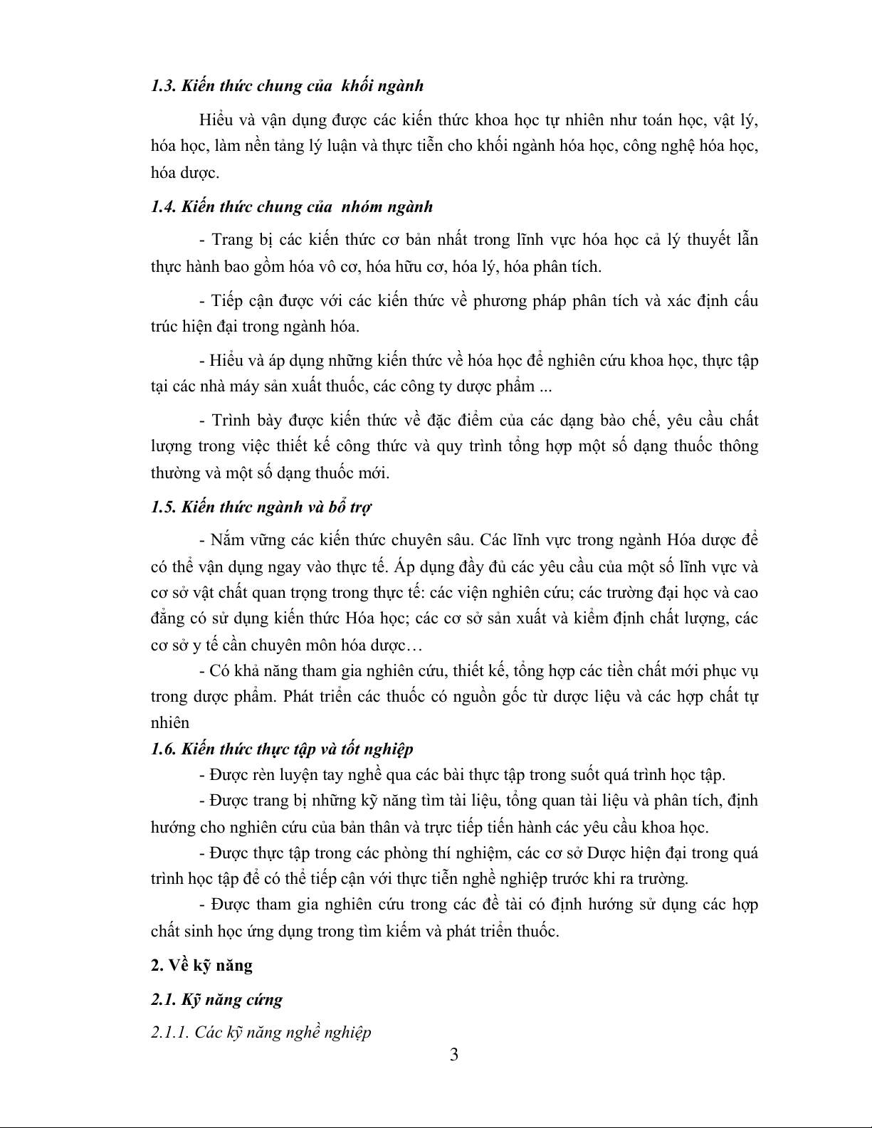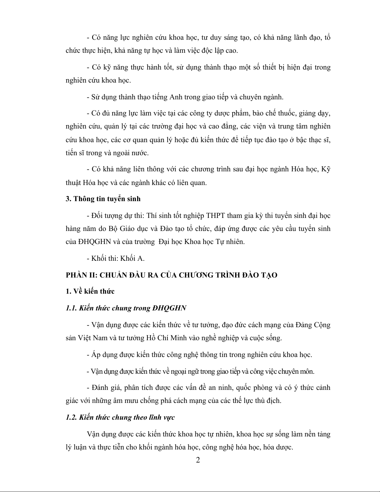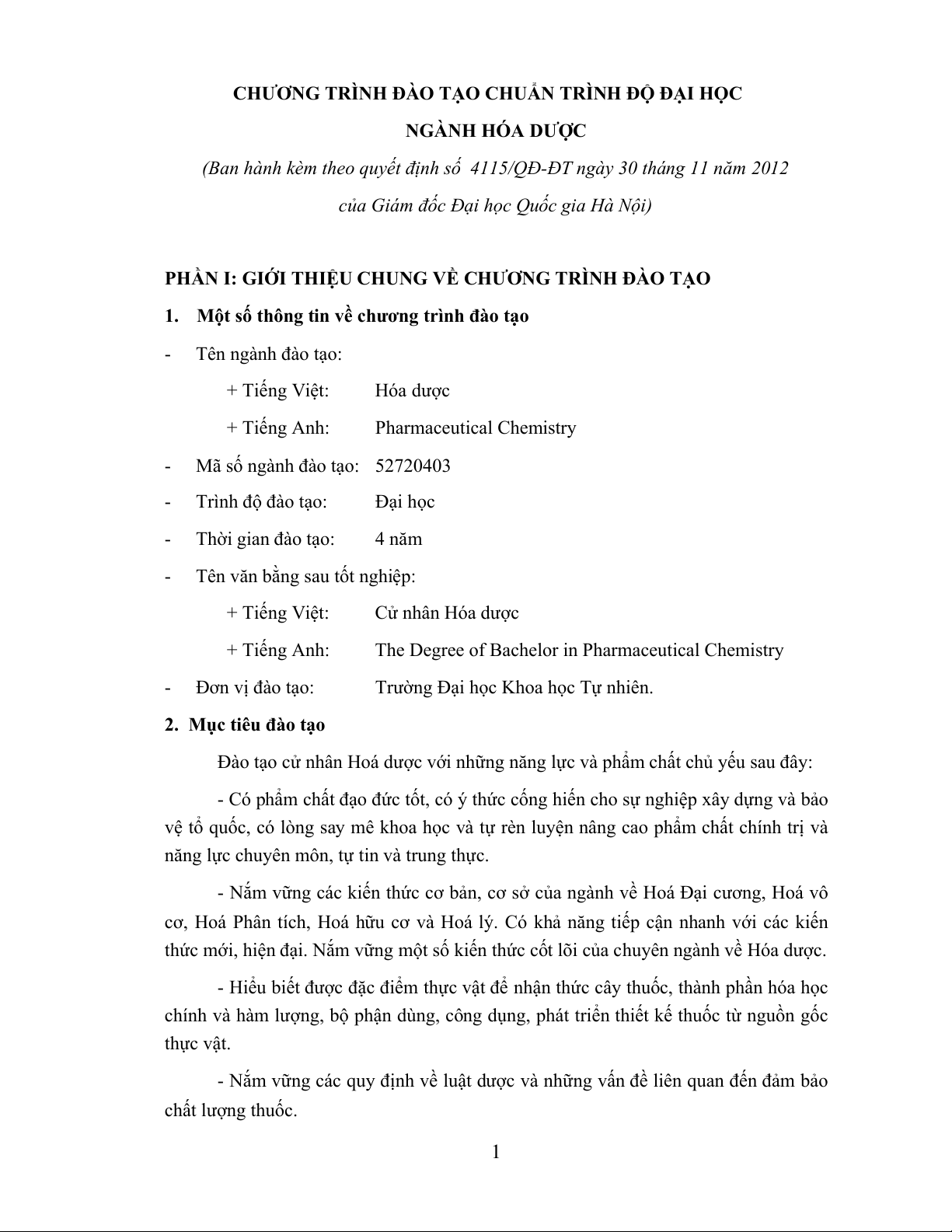 1. Một số thông tin về chương trình đào tạo - Tên ngành đào tạo: + Tiếng Việt: Hóa dược + Tiếng Anh: Pharmaceutical Chemistry