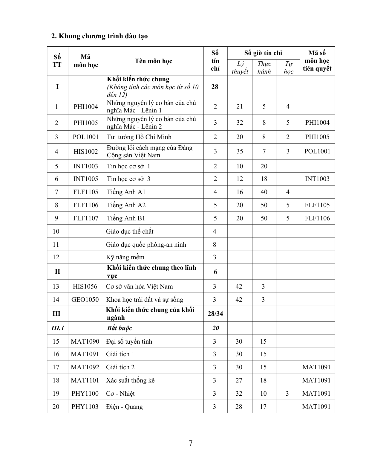 MAT1101 Xác suất thống kê 3 27 18 MAT1091 19 PHY1100 Cơ - Nhiệt 3 32 10 3 MAT1091 20 PHY1103 Điện - Quang 3 28 17 MAT1091 7 Số