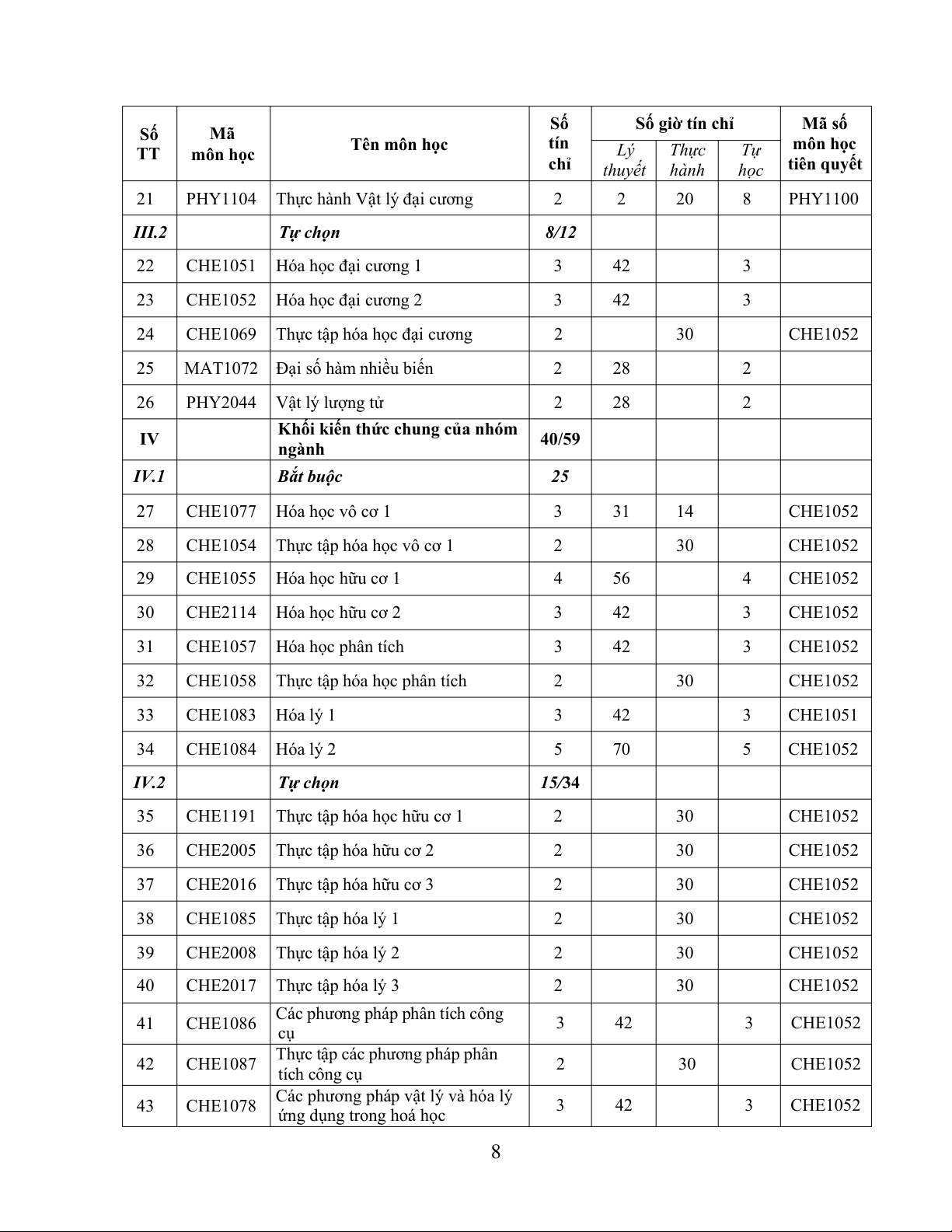 CHE2008 Thực tập hóa lý 2 2 30 CHE1052 40