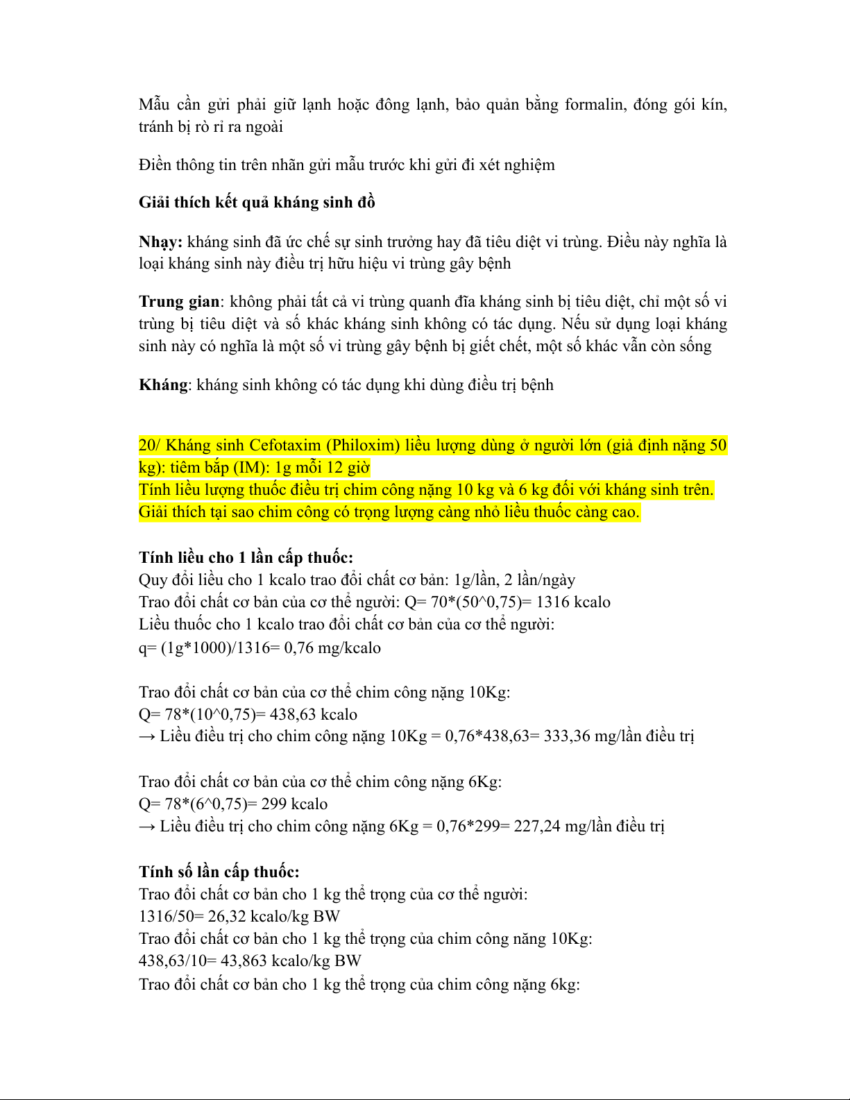 Tính liều lượng thuốc điều trị chim công nặng 10 kg và 6 kg đối với kháng sinh trên.