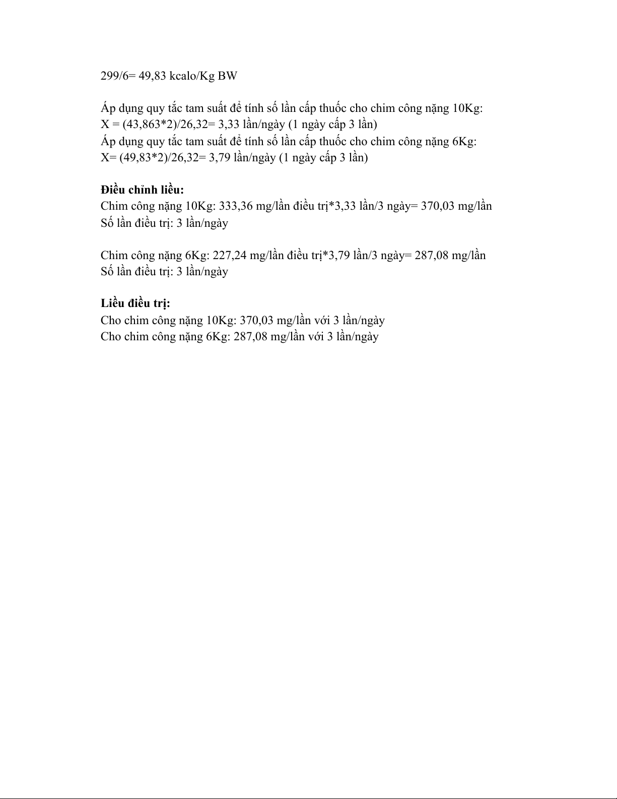 → Liều điều trị cho chim công nặng 6Kg = 0,76*299= 227,24 mg/lần điều trị