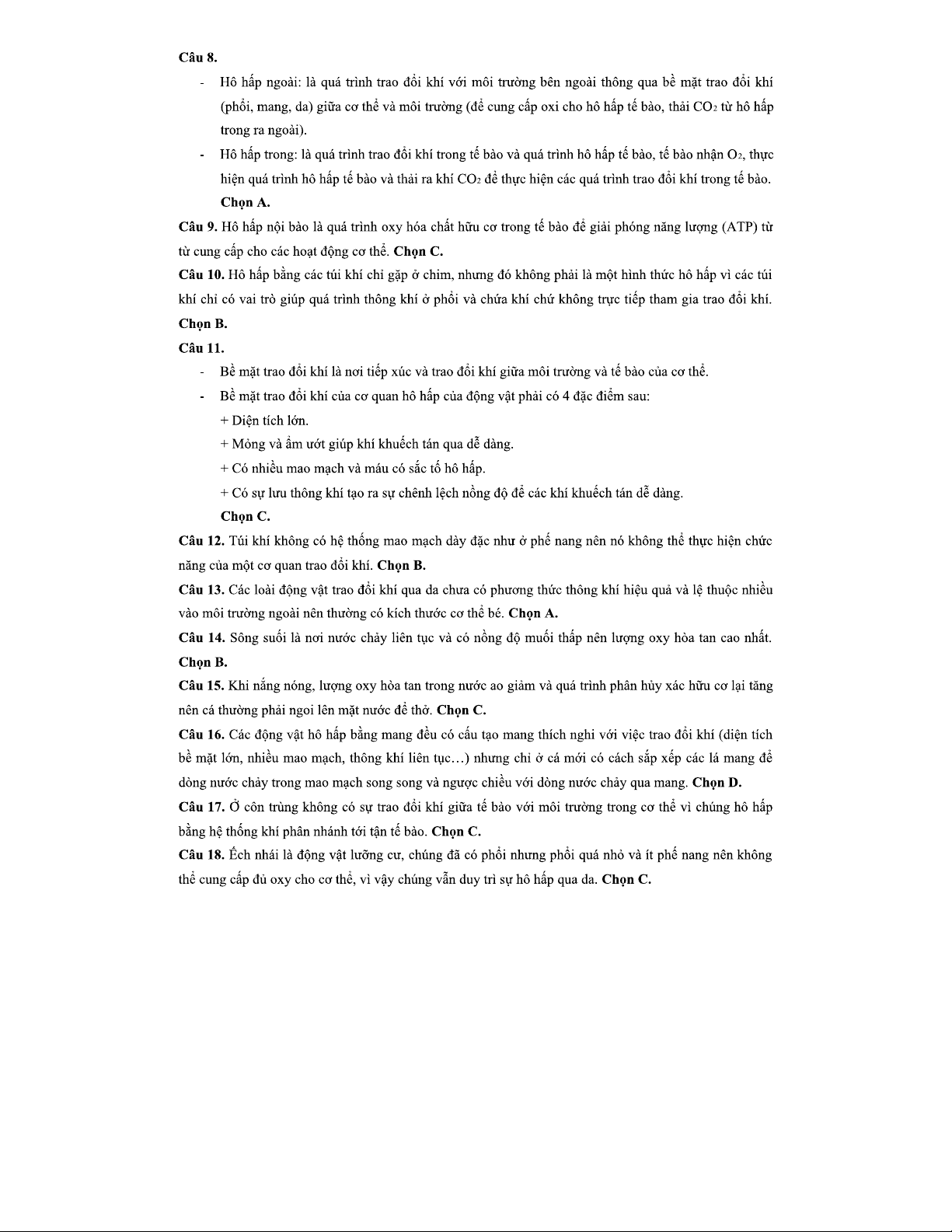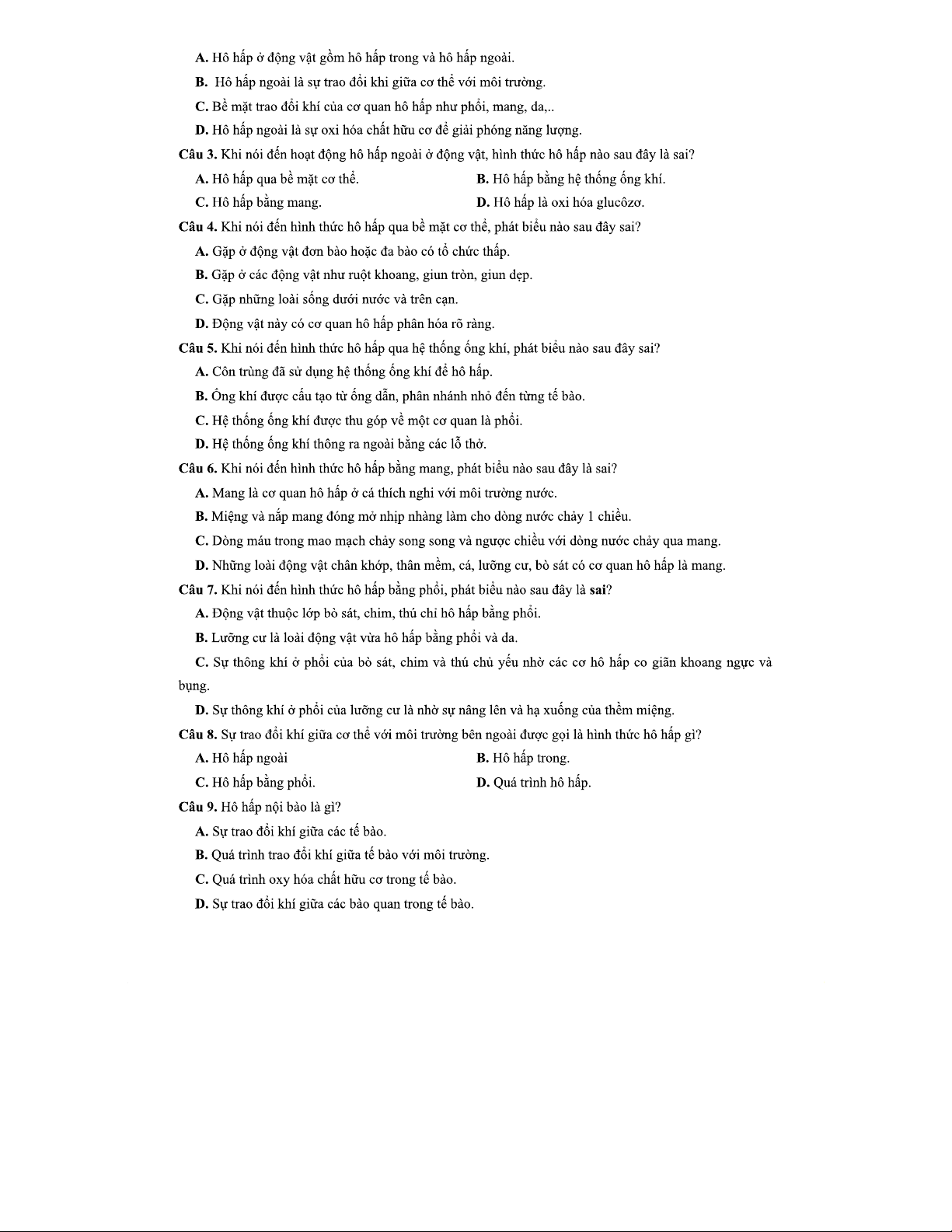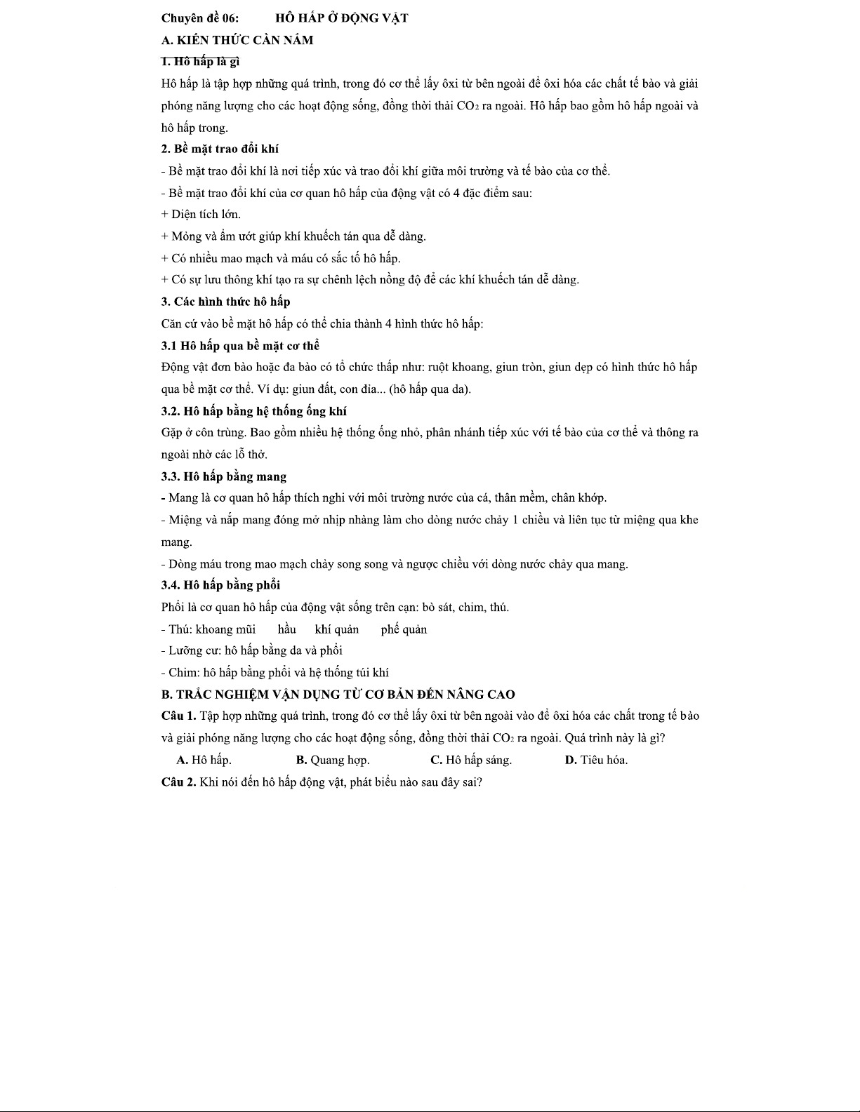 Chuyên đề 06: Hô Hấp Ở Động Vật - Kiến Thức Cơ Bản và Trắc Nghiệm