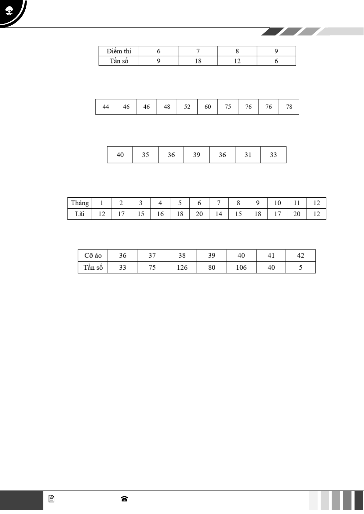 Câu 1: Tập đoàn X có 24 công ty. Thống kê cuối năm cho biết doanh thu (đơn vị triệu đồng) của 24 công ty con như sau: