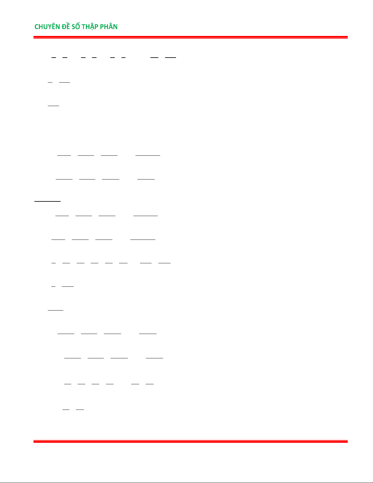 Bài 3: Viết kết quả phép tính dưới dạng số thập phân: 1 1 1 1 a) A = + + +...+ 5.10 10.15 15.20 395.400 33 33 33 33 b) B = + + +...+ 11.16 16.21 21.26 61.66 Lời giải: 1 1 1 1 a) A = + + +...+ 5.10 10.15 15.20 395.400 5 5 5 5 5A = + + +...+ 5.10 10.15 15.20 395.400 1 1 1 1 1 1 1 1 5A = − + − + − ...+ − 5 10 10 15 15 20 395 400 1 1 5A = − 5 400 79 A = = 0,0395 2000 33 33 33 33 b) B = + + +...+ 11.16 16.21 21.26 61.66 5 5 5 5 5B 33. ... = + + + + 11.16 16.21 21.26 61.66 1 1 1 1 1 1 5B 33. ... = − + − + + − 11 16 16 21 61 66 1 1 5B 33 = − 11 66