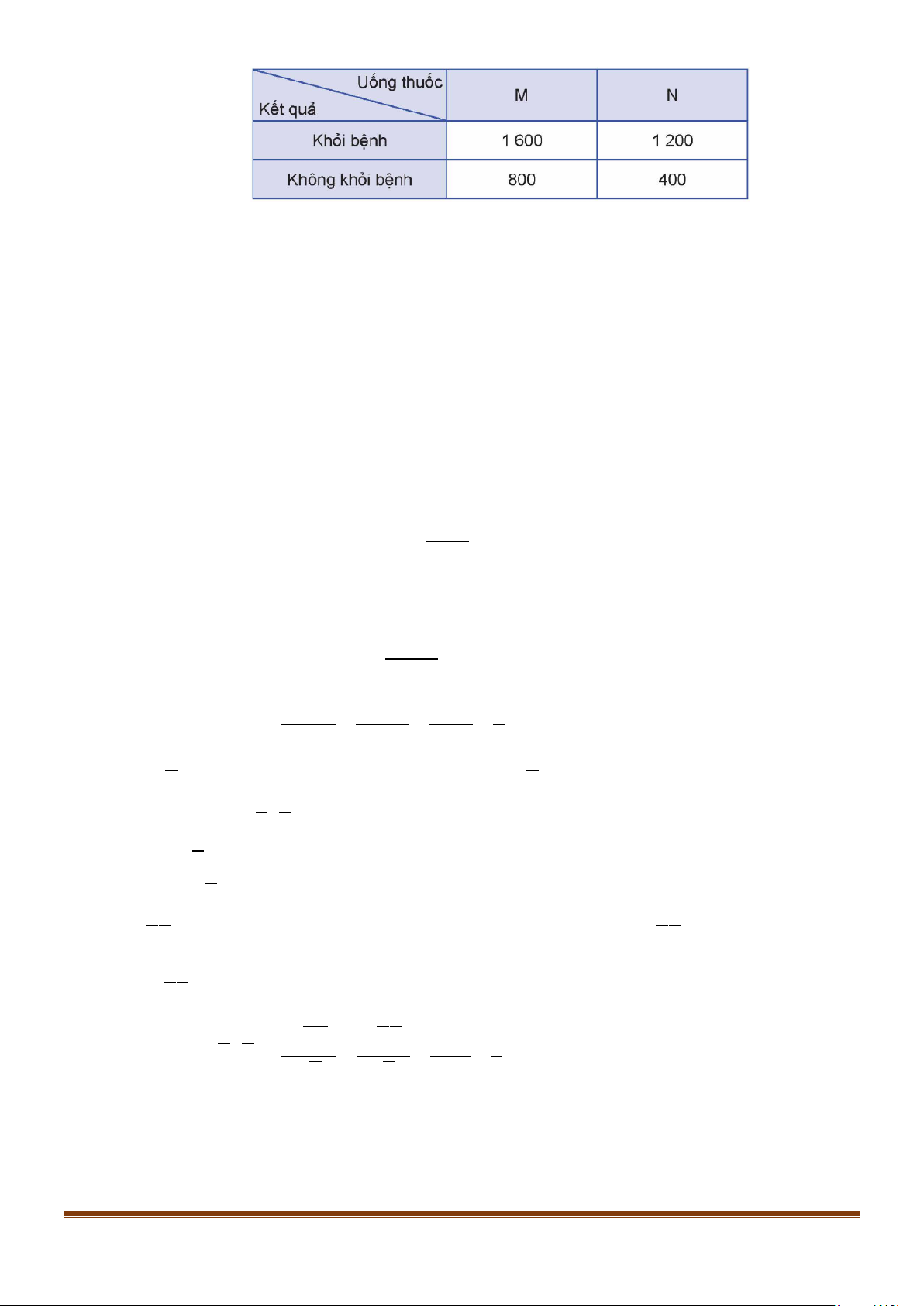 không gian mẫu gồm các bệnh nhân uống thuốc N và không khỏi bệnh, suy ra n(AB) = 400. P AB n( AB) Do đó P( A B) ( ) 400 1 | = = = = . P(B) n(B) 1 200 3
