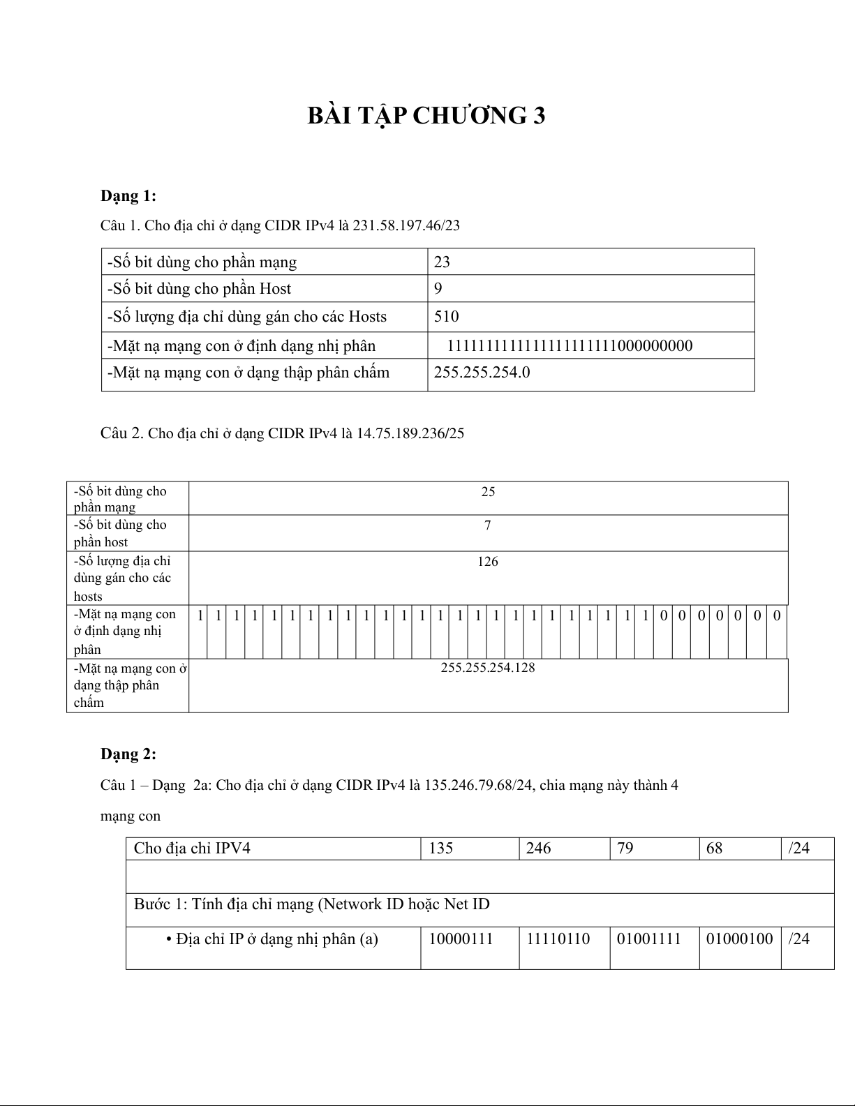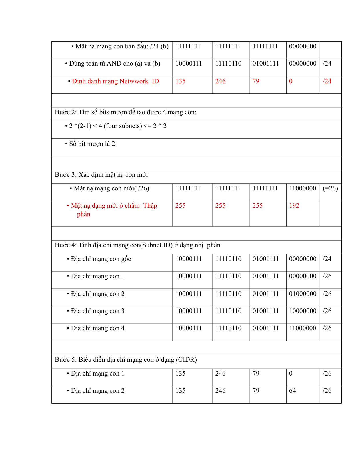 Câu 1 – Dạng 2a: Cho địa chỉ ở dạng CIDR IPv4 là 135.246.79.68/24, chia mạng này thành 4 mạng con Cho địa chỉ IPV4 135 246 79 68 /24
