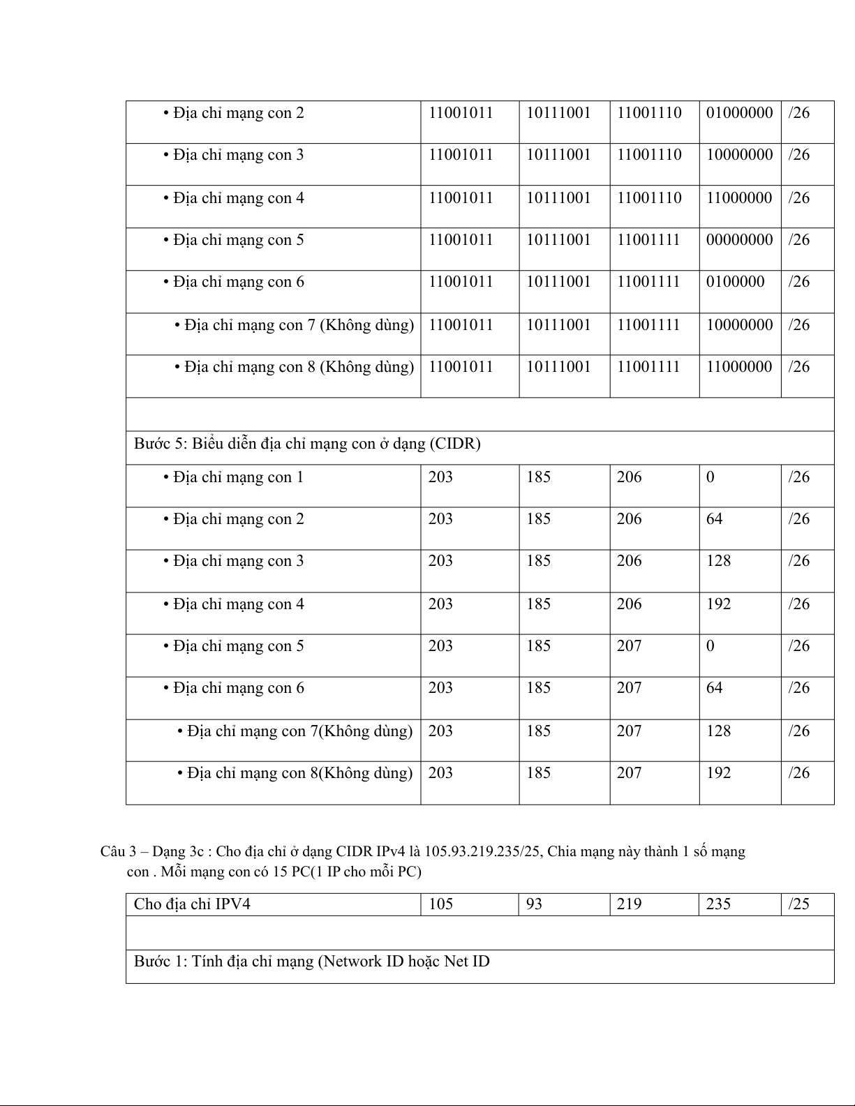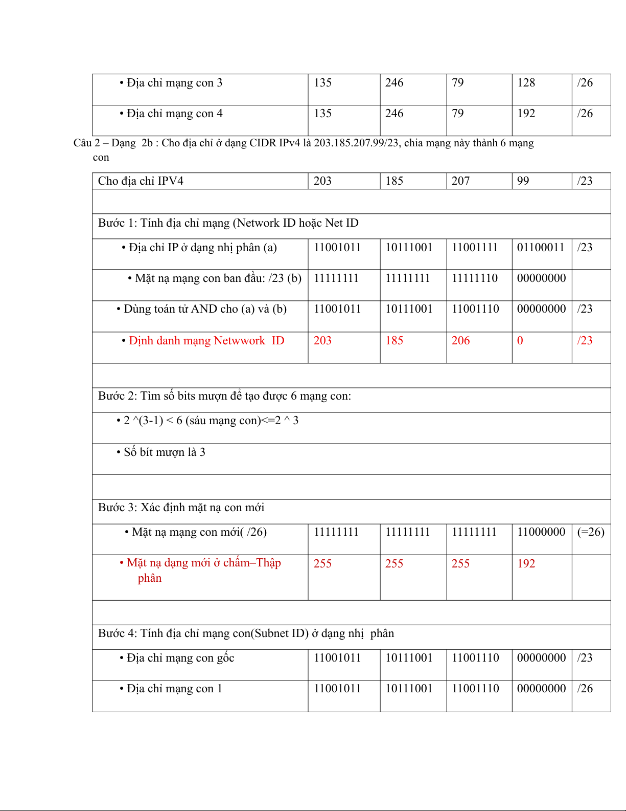Câu 2 – Dạng 2b : Cho địa chỉ ở dạng CIDR IPv4 là 203.185.207.99/23, chia mạng này thành 6 mạng con Cho địa chỉ IPV4 203 185 207 99 /23