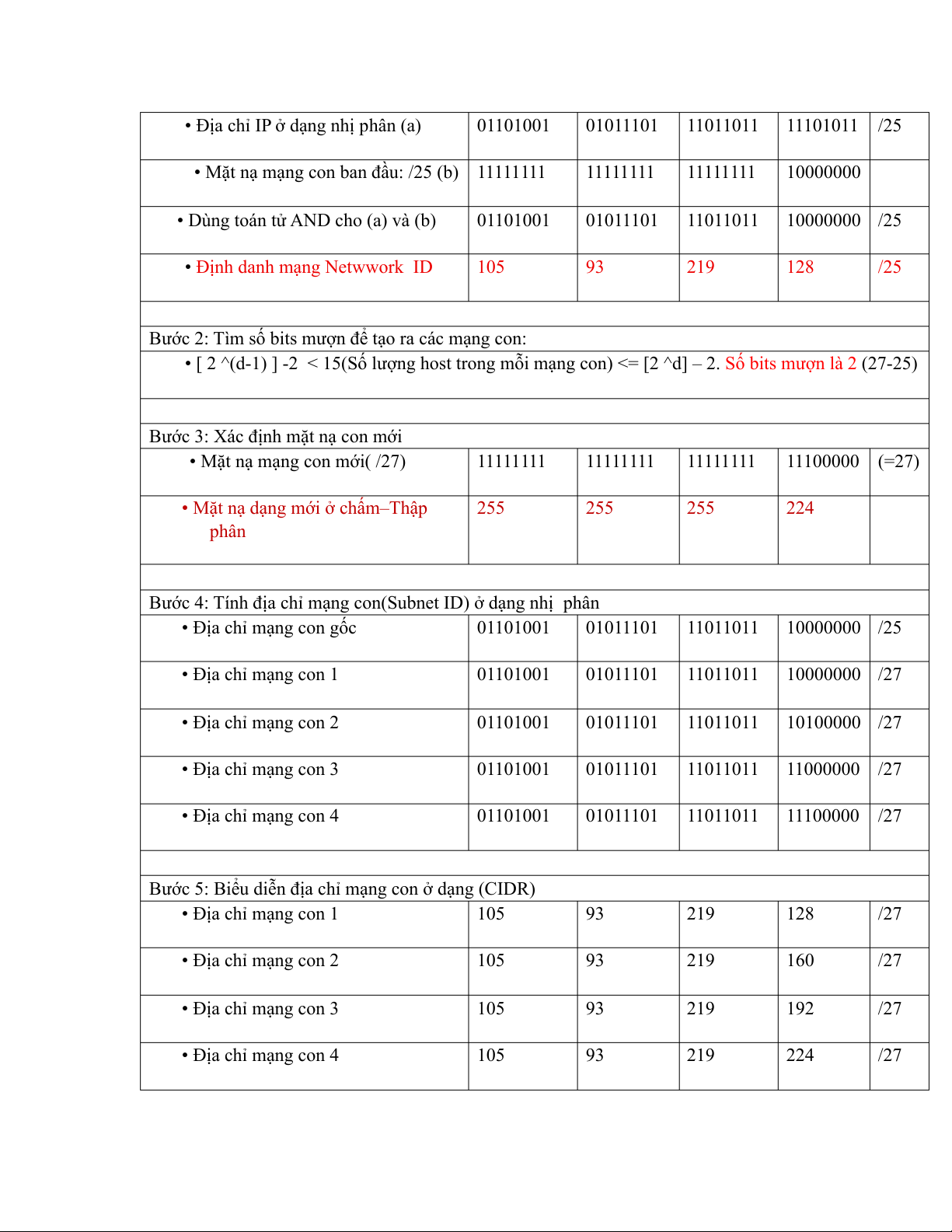 Bước 5: Biểu diễn địa chỉ mạng con ở dạng (CIDR) • Địa chỉ mạng con 1 105 93 219 128 /27 • Địa chỉ mạng con 2 105 93 219 160 /27 • Địa chỉ mạng con 3 105 93 219 192 /27 • Địa chỉ mạng con 4 105 93 219 224 /27 Dạng 3: