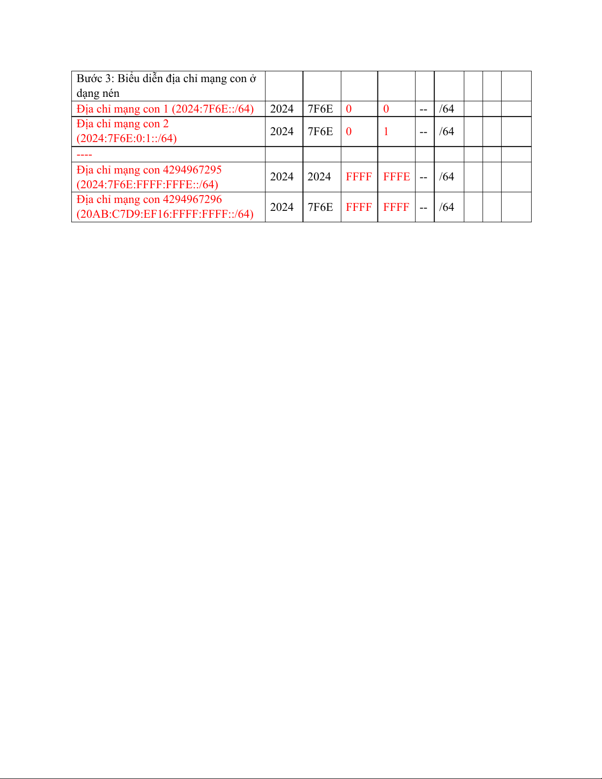 Bước 3: Biểu diễn địa chỉ mạng con ở dạng nén Địa chỉ mạng con 1 (20AB:C7D9:EF16::/64) 20AB C7D9 EF16 -- -- /64 Địa chỉ mạng con 2 (20AB:C7D9:EF16:1::/64) 20AB C7D9 EF16 1 -- /64 ---- Địa chỉ mạng con 65535 (20AB:C7D9:EF16:FFFE::/64) 20AB C7D9 EF16 FFFE -- /64 Địa chỉ mạng con 65536 (20AB:C7D9:EF16:FFFF::/64) 20AB C7D9 EF16 FFFF -- /64