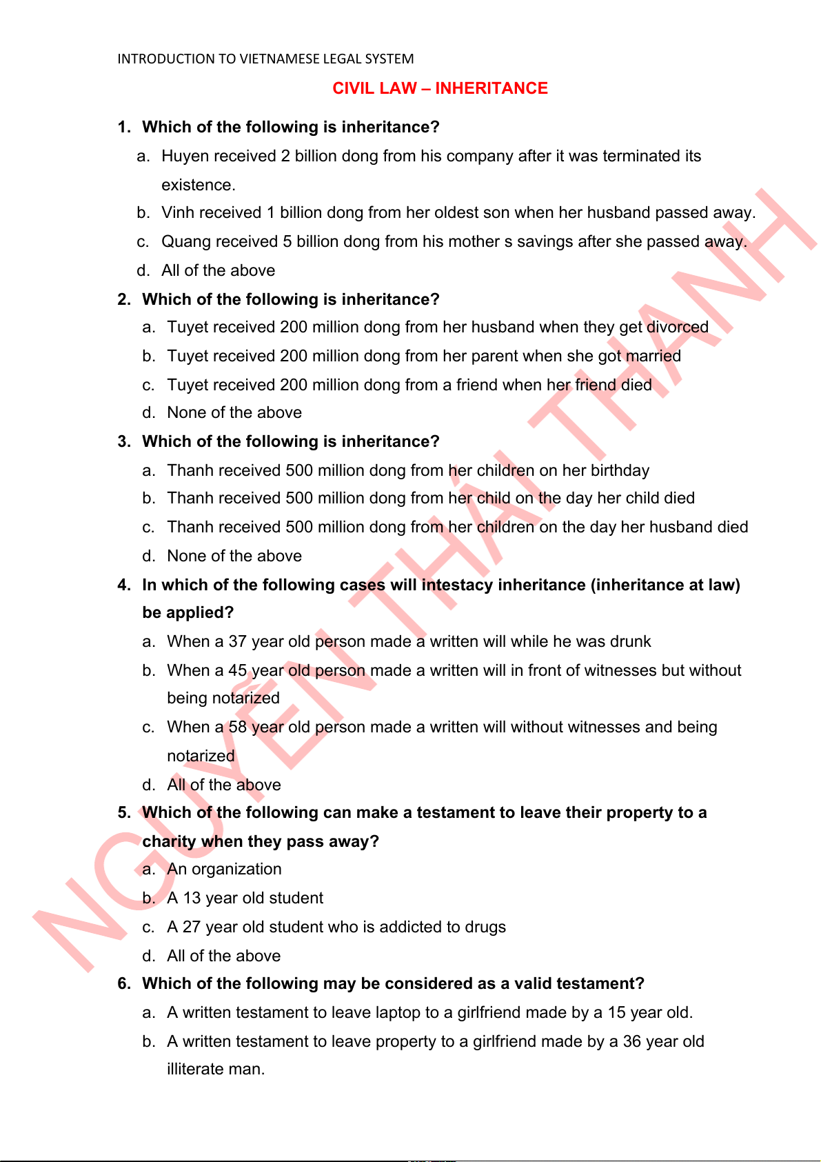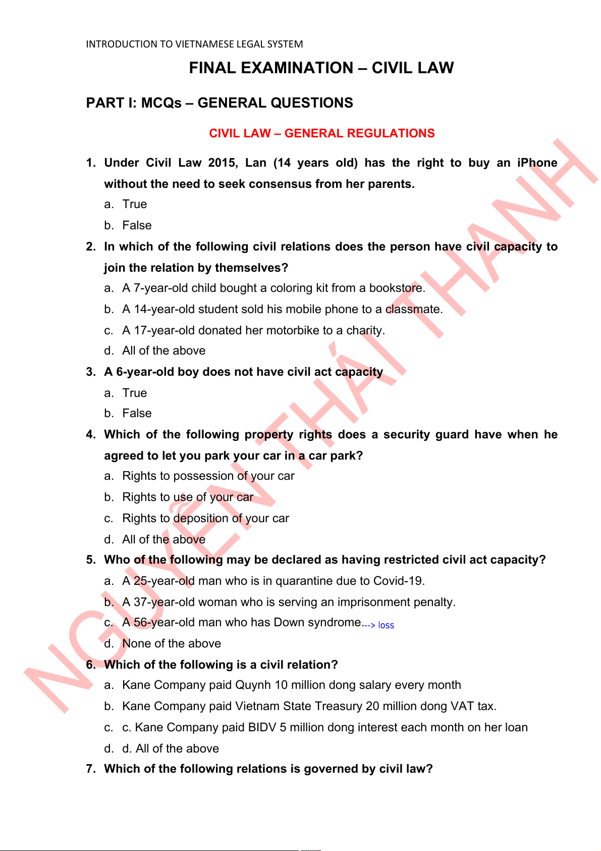 FINAL EXAMINATION – CIVIL LAW