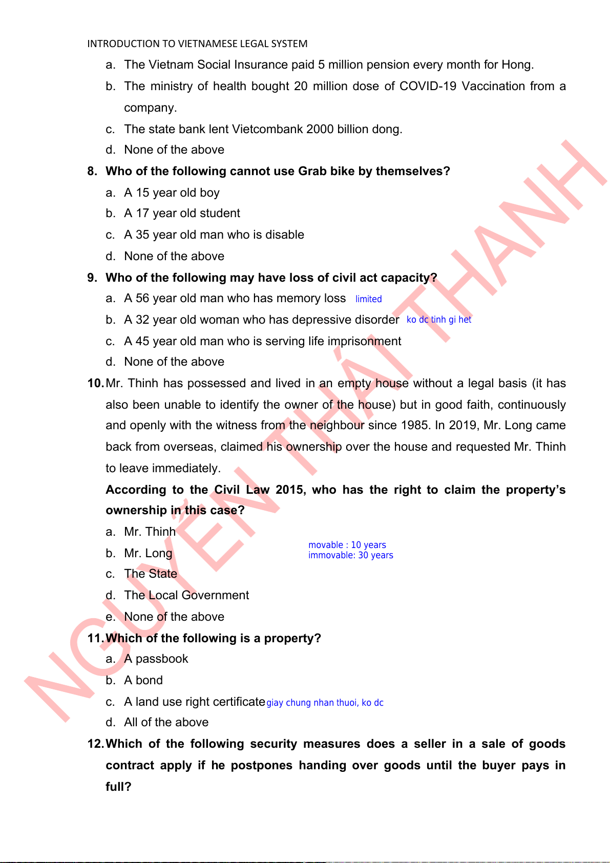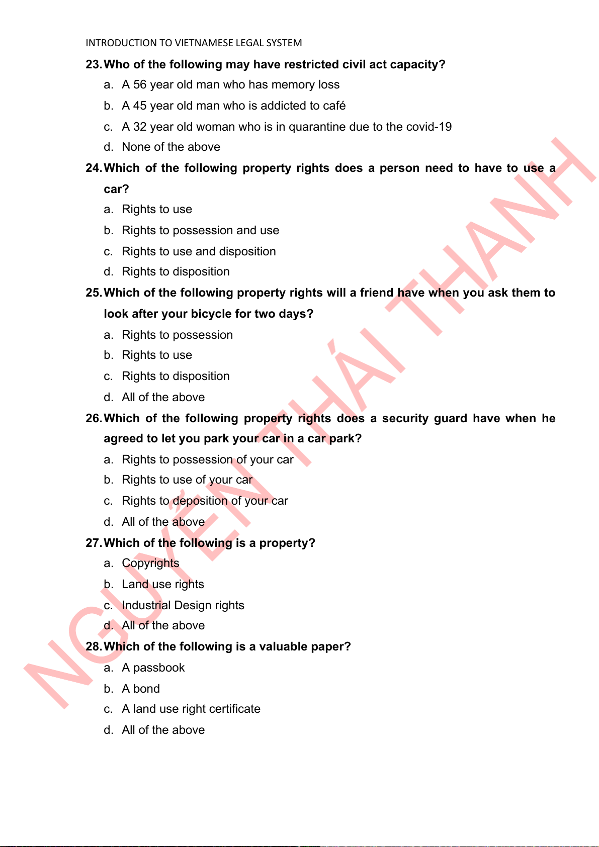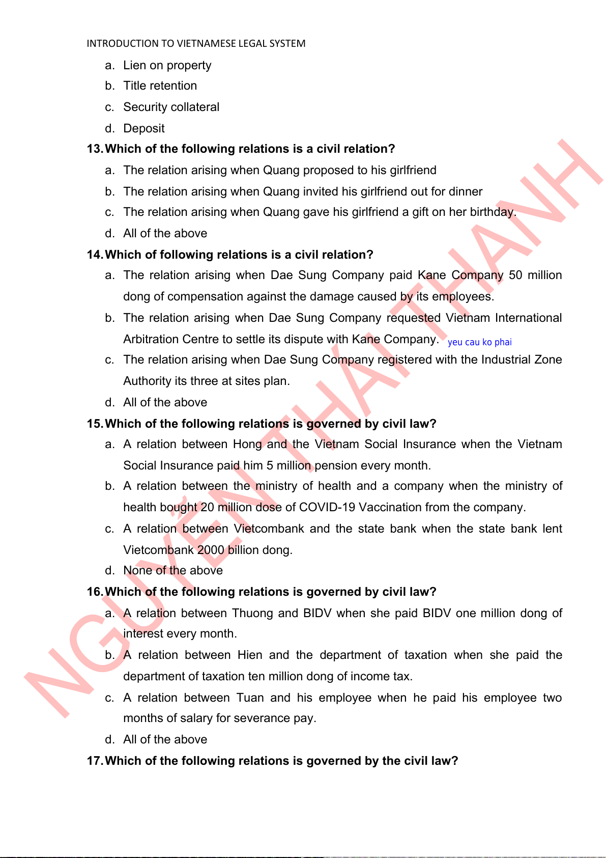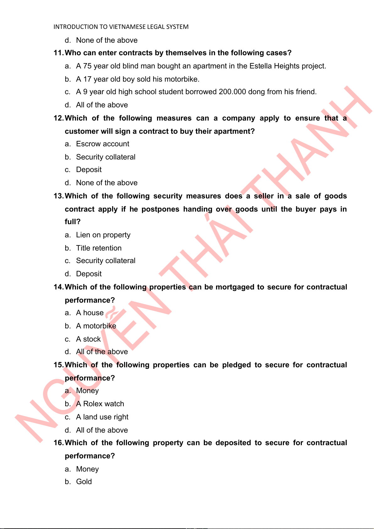 INTRODUCTION TO VIETNAMESE LEGAL SYSTEM a. Lien on property b. Title retention c. Security collateral d. Deposit