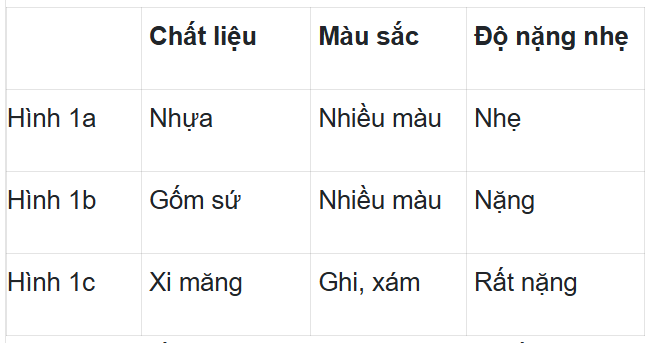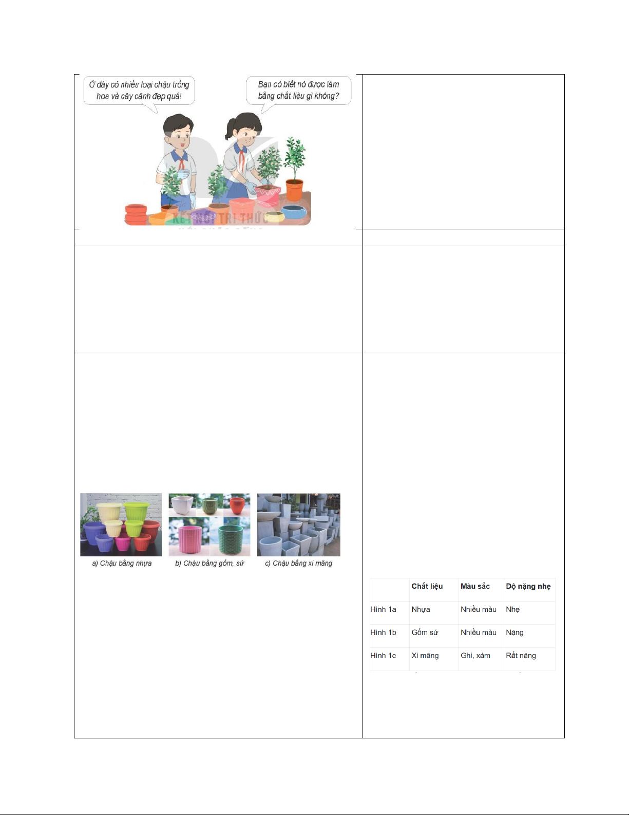 * Hoạt động 1. Tìm hiểu về chậu trồng hoa, cây cảnh (7 phút) - GV yêu cầu HS thảo luận nhóm 6, quan sát Hình 1 SHS tr17 và thực hiện nhiệm vụ: Nêu đặc điểm của các loại chậu trồng cây trong các hình theo gợi ý sau: + Chất liệu. + Màu sắc. + Độ nặng nhẹ.