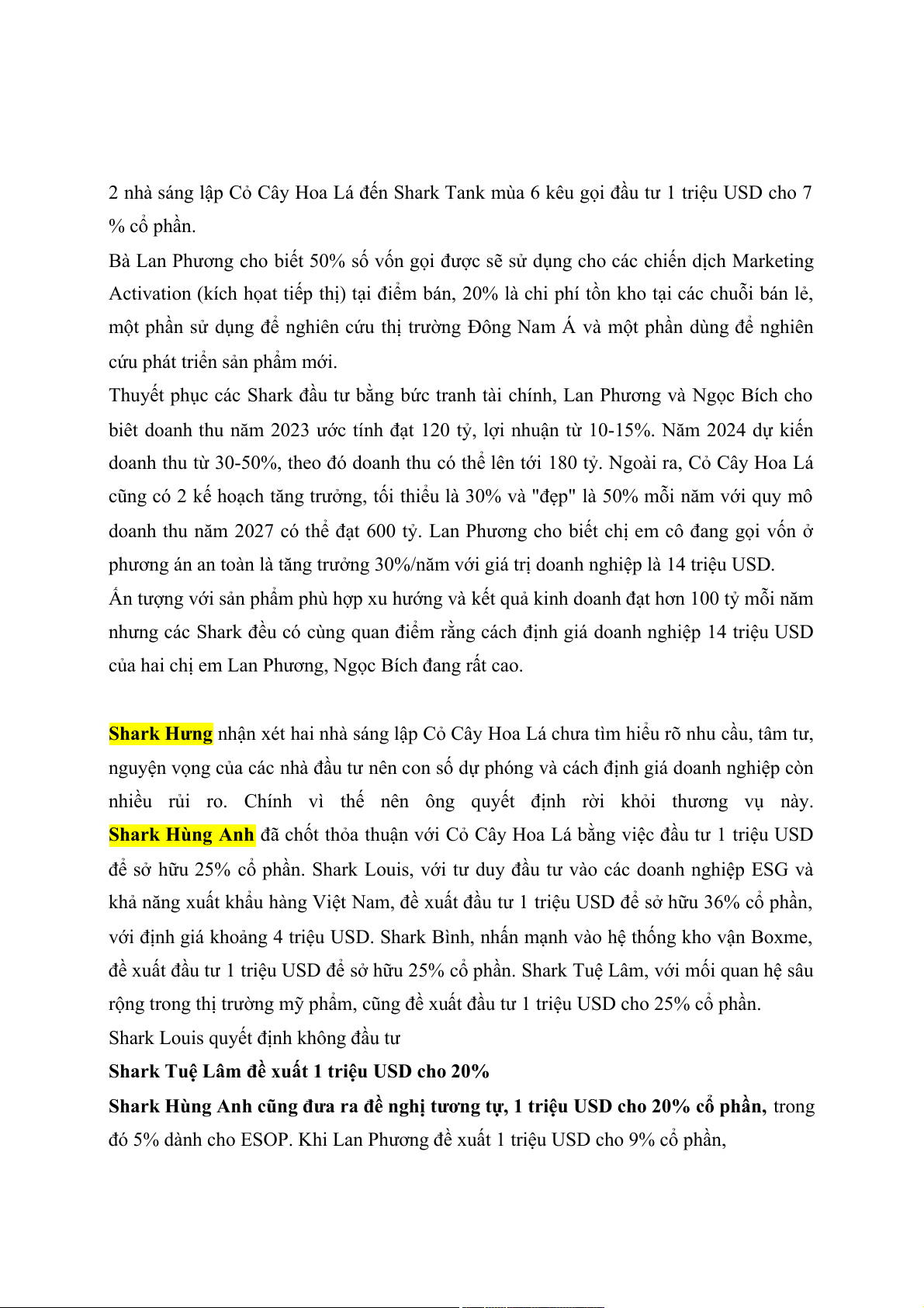 Shark Hùng Anh đã chốt thỏa thuận với Cỏ Cây Hoa Lá bằng việc đầu tư 1 triệu USD
