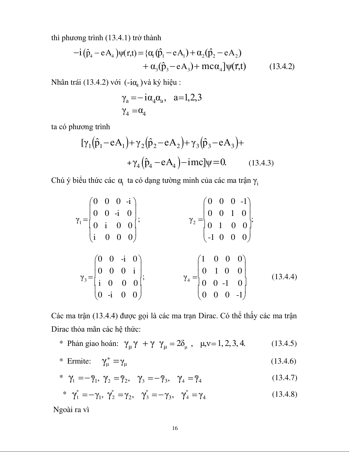 Chú ý biểu thức các iα ta có dạng tường minh của các ma trận iγ 0 0 0 -i 0 0 0 -1 0 0 -i 0 0 0 1 0 ; ; 1 γ 0 i 0 0 γ2 0 1 0 0 i 0 0 0 -1 0 0 0 0 0 -i 0 1 0 0 0 0 0 0 i 0 1 0 0 γ ; (13.4.4) 3 i 0 0 0 γ4 0 0 -1 0 0 -i 0 0 0 0 0 -1
