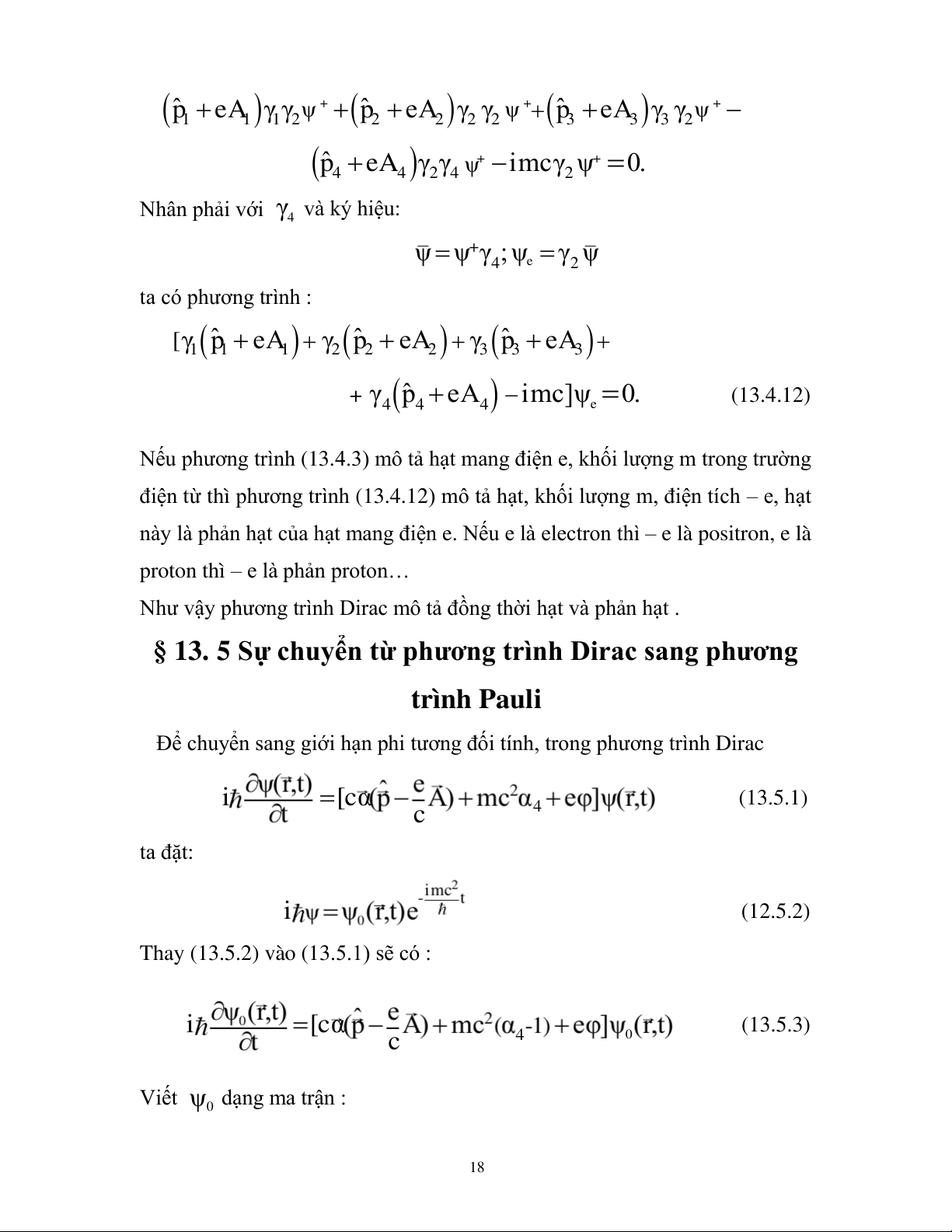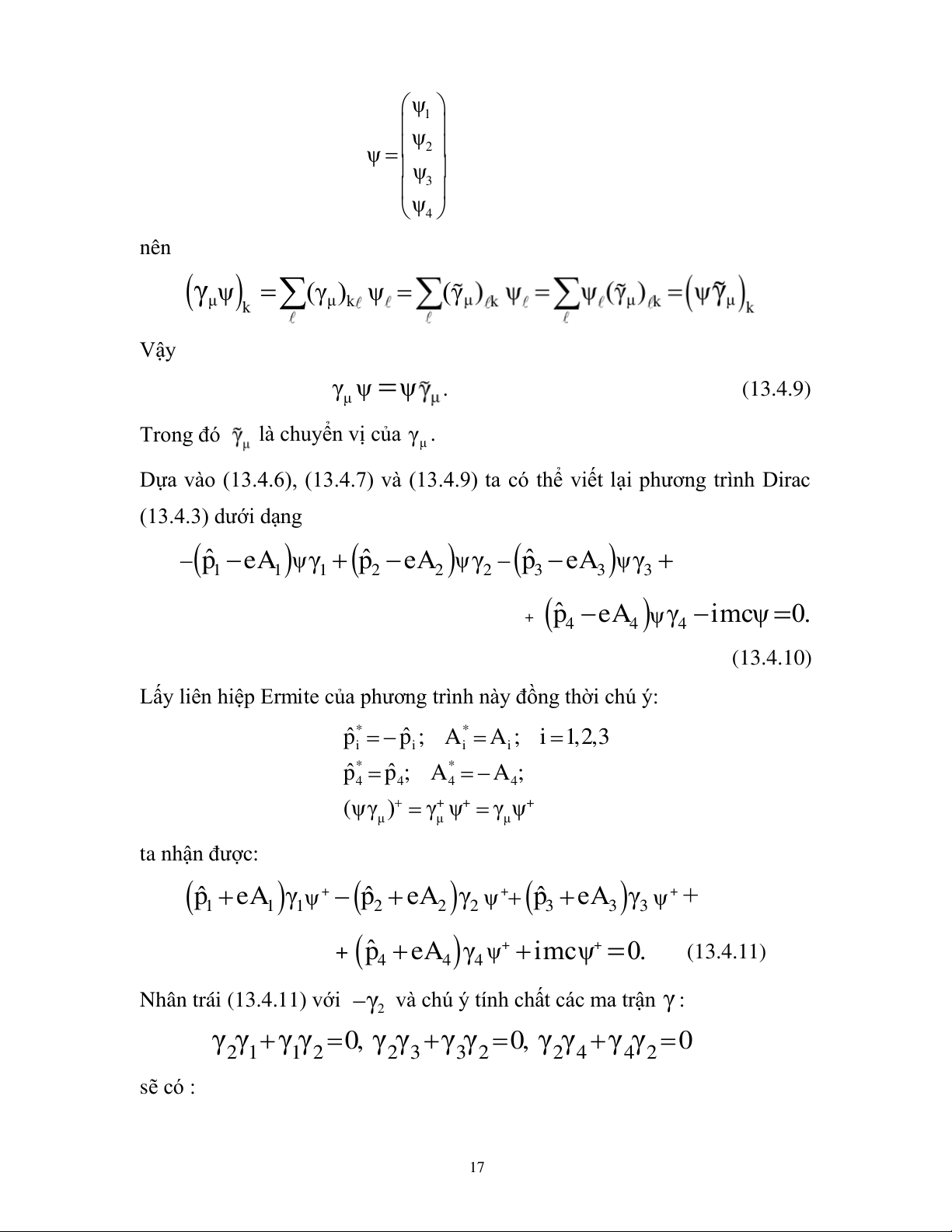 γ γ20, γ2γ3γ3γ20, γ2γ4γ4γ20 sẽ có : 17 ˆp eA + γ γ ψ ˆp eA + γ γ ψ ˆp eA + 1 1 1 2 2 2 2 2 3 3 3 γ 2 γ ψ ˆp eA + + 4 4 2 γ 4 γ ψ imc 2 γ ψ 0. Nhân phải với 4 γ và ký hiệu: + ψ ψ 4 γ ; e ψ γ2 ψ ta có phương trình : [ 1γˆ1p e 1 A 2 γ ˆ2 p e 2 A 3 γ ˆ3 p e 3 A + γ 4ˆ 4 p e 4 A imc] e ψ 0. (13.4.12)