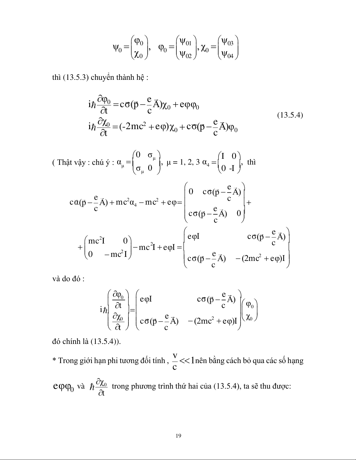 thì (13.5.3) chuyển thành hệ : i 0 eφ 0 φ c (13.5.4) χ 2 i 2mc eφ)χ0 cσ 0 c 0 σ I 0 ( Thật vậy : chú ý : μ α , μ = 1, 2, 3 α , thì μ 4 σ 0 0 -I μ 0 cσ 2 c cα