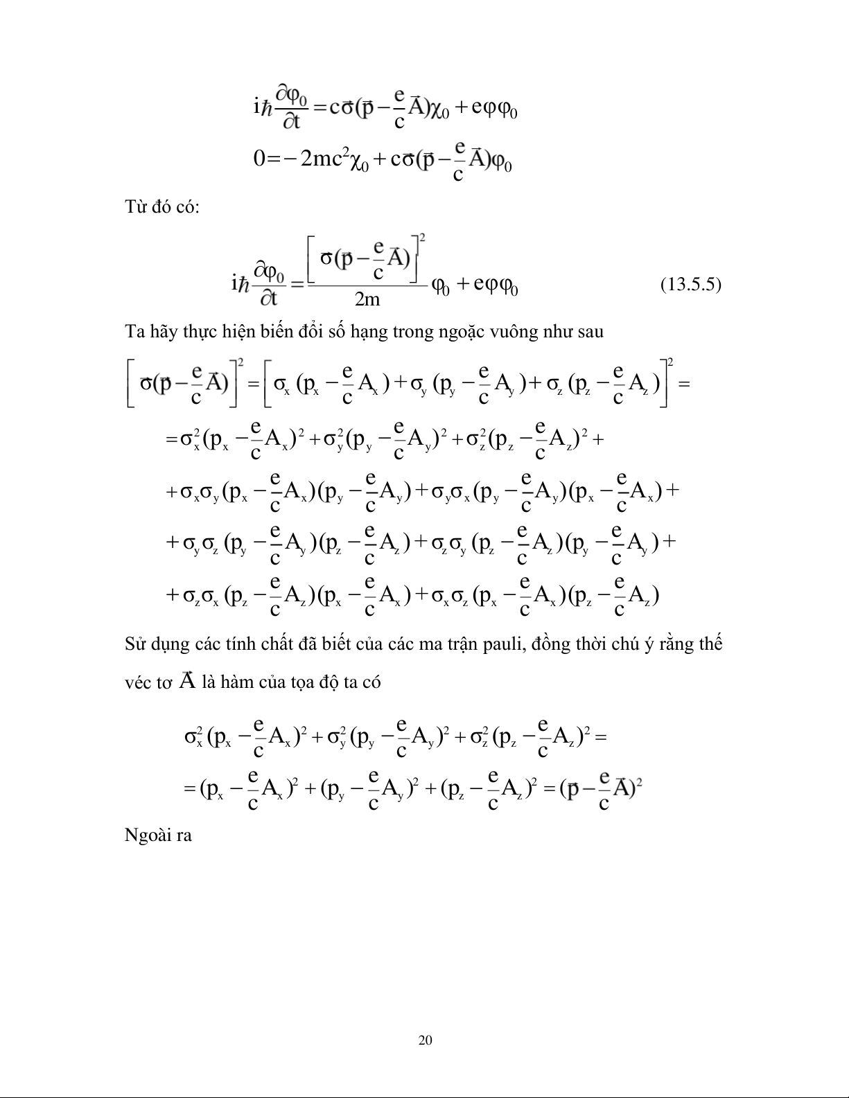 trong phương trình thứ hai của (13.5.4), ta sẽ thu được: 19 i 0 eφ 0 φ c 2 0 2mc χ0 cσ 0 c Từ đó có: σ φ c i 0 φ eφ 0 (13.5.5) 2m φ