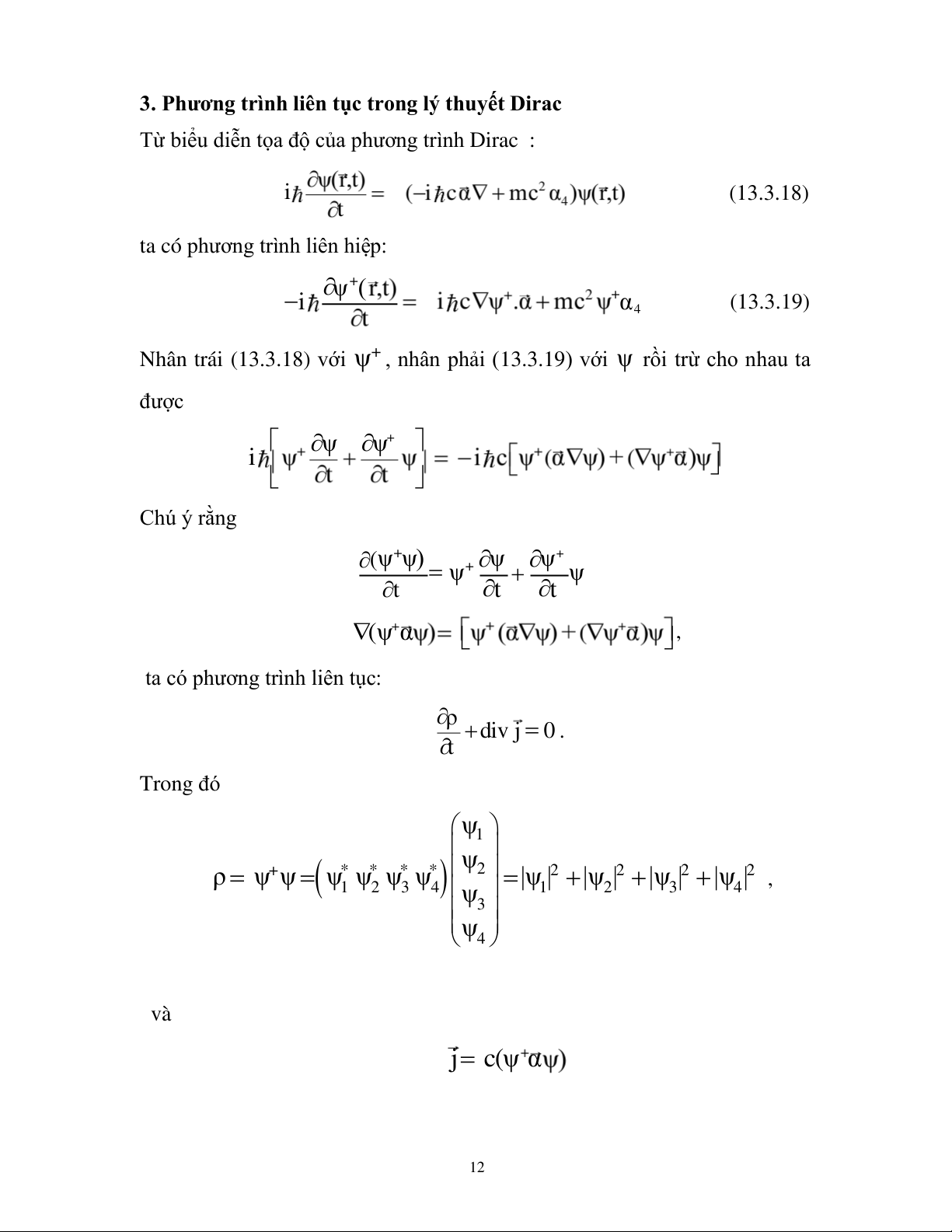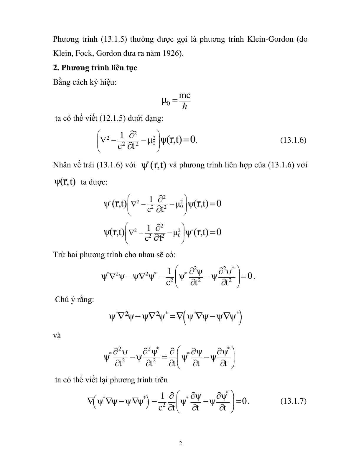 tương đối tính cho hạt tự do ρe div j 0 (13.1.8) e t Trong đó: e * * j (13.1.9) e ψ ψ ψ ψ 2mi và: * e *ψ ψ (13.10) ρ ψ ψ e 2mic2 t t
