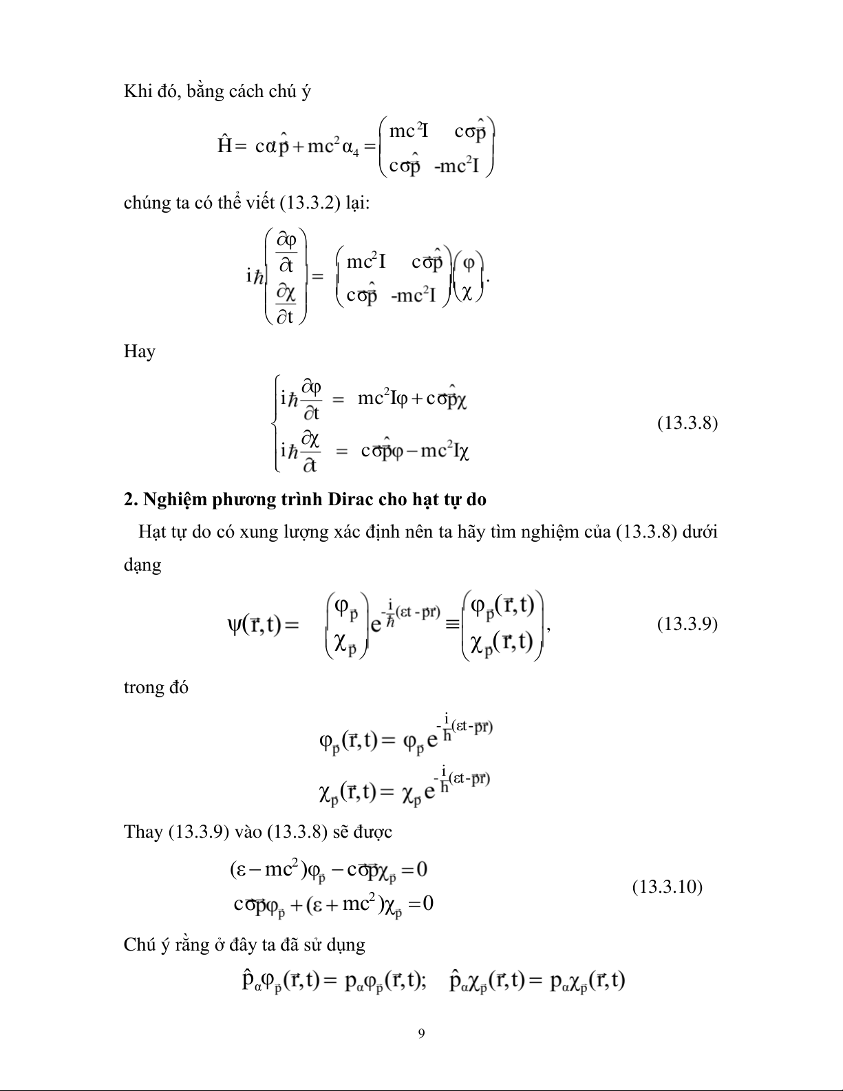 Hạt tự do có xung lượng xác định nên ta hãy tìm nghiệm của (13.3.8) dưới dạng φ φ ( ψ( , (13.3.9) χ χ ( trong đó i - (εt- φ ( i - (εt- χ (