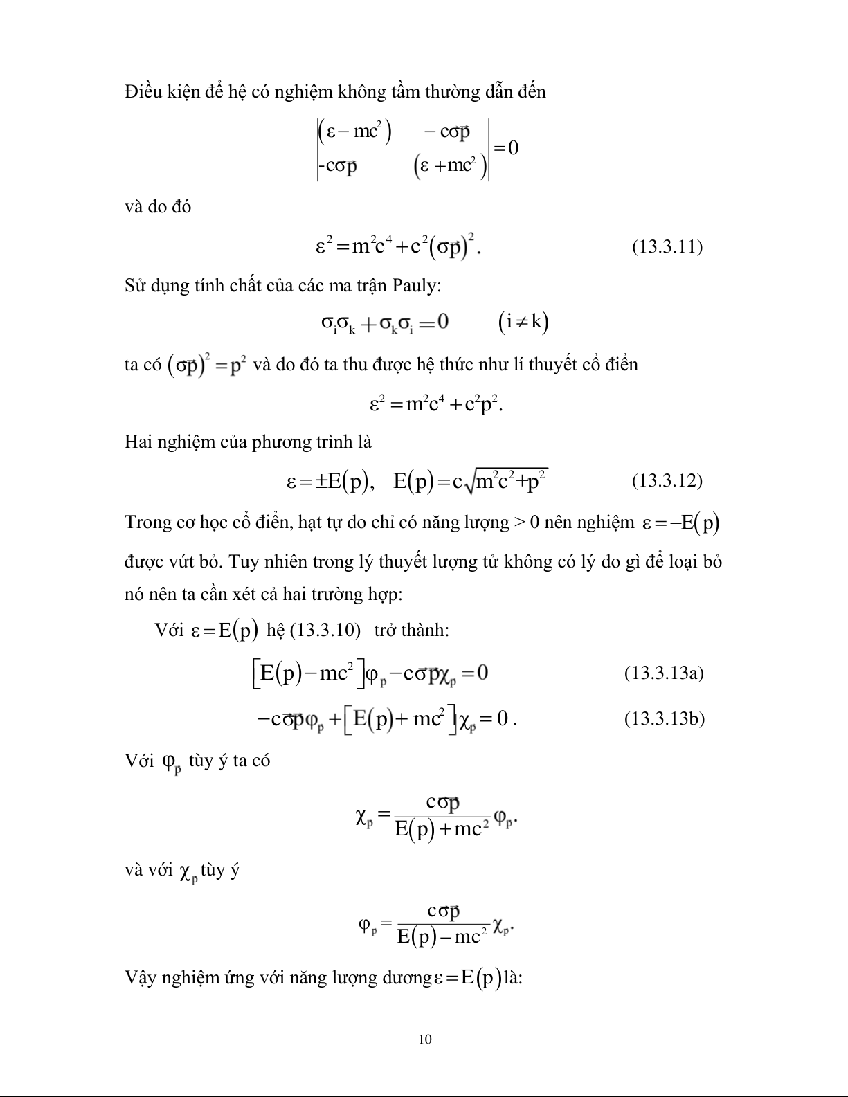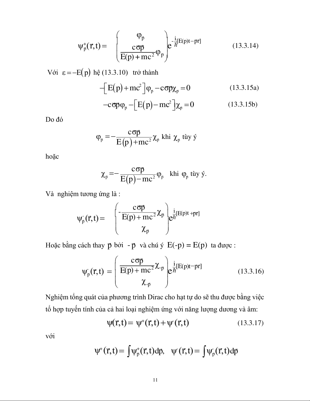 Vậy nghiệm ứng với năng lượng dương Eplà: 10 i + - [E(p)t ψ ( cσ e (13.3.14) 2 E(p) + mc φ Với ε E p hệ (13.3.10) trở thành 2 E p mc φ cσ (13.3.15a) 2 c σ