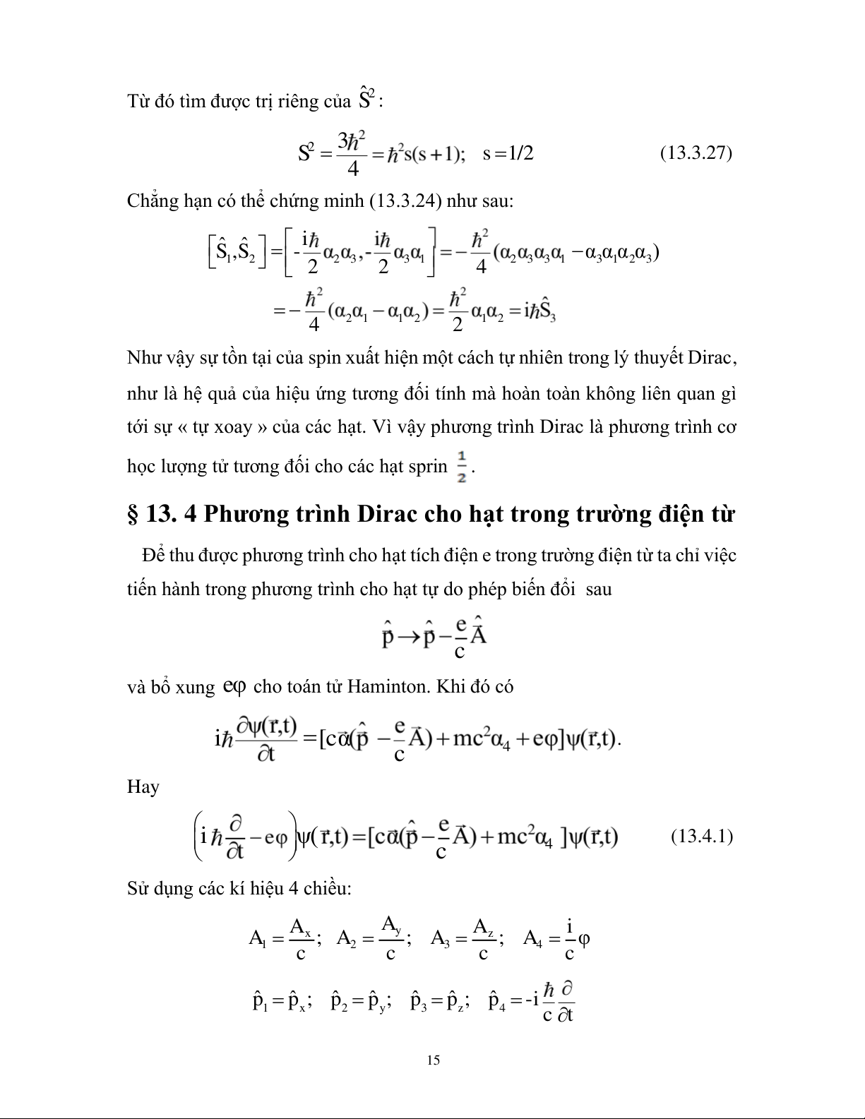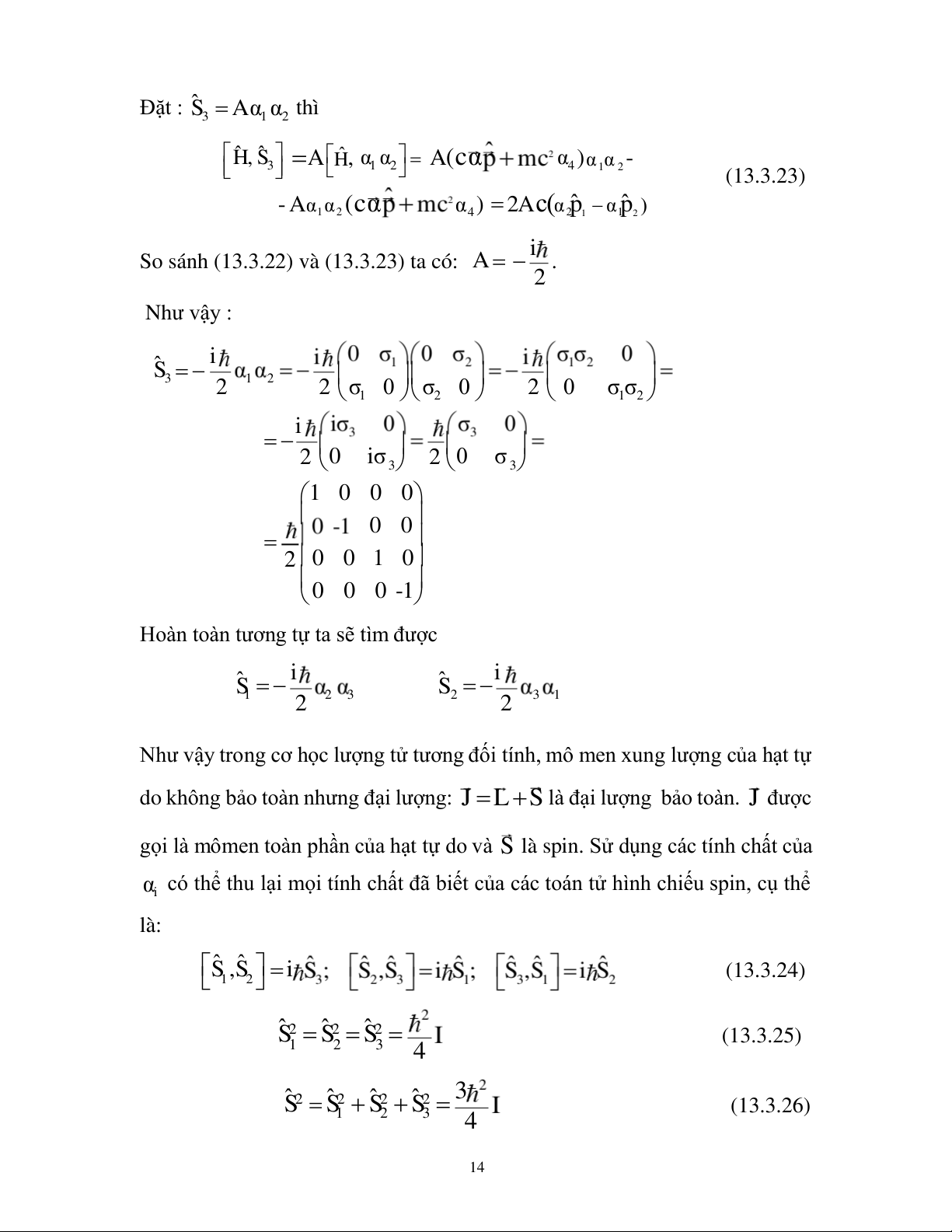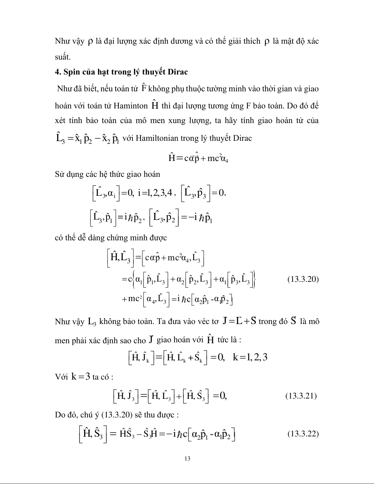 có thể dễ dàng chứng minh được ˆ ˆ ˆ H,L 3 cα 4 α , 3 L cα ˆ ˆ p ,L α ˆ ˆ p ,L α ˆ ˆ 1 1 3 (13.3.20) 2 2 3 1 p 3,L3 2 mc ˆ α 4,L3 i α 1ˆ p2 Như vậy 3