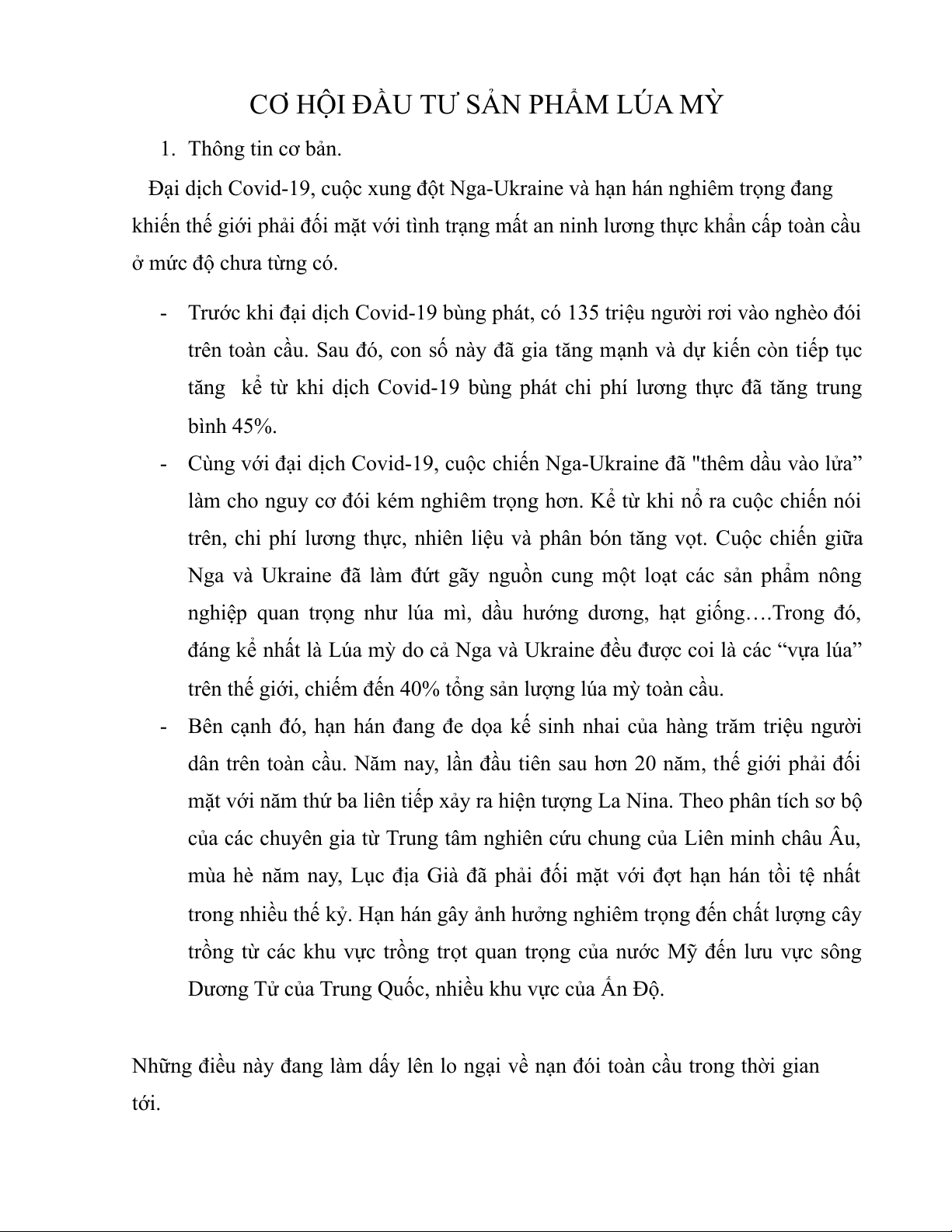 CƠ HỘI ĐẦU TƯ SẢN PHẨM LÚA MỲ 1. Thông tin cơ bản.