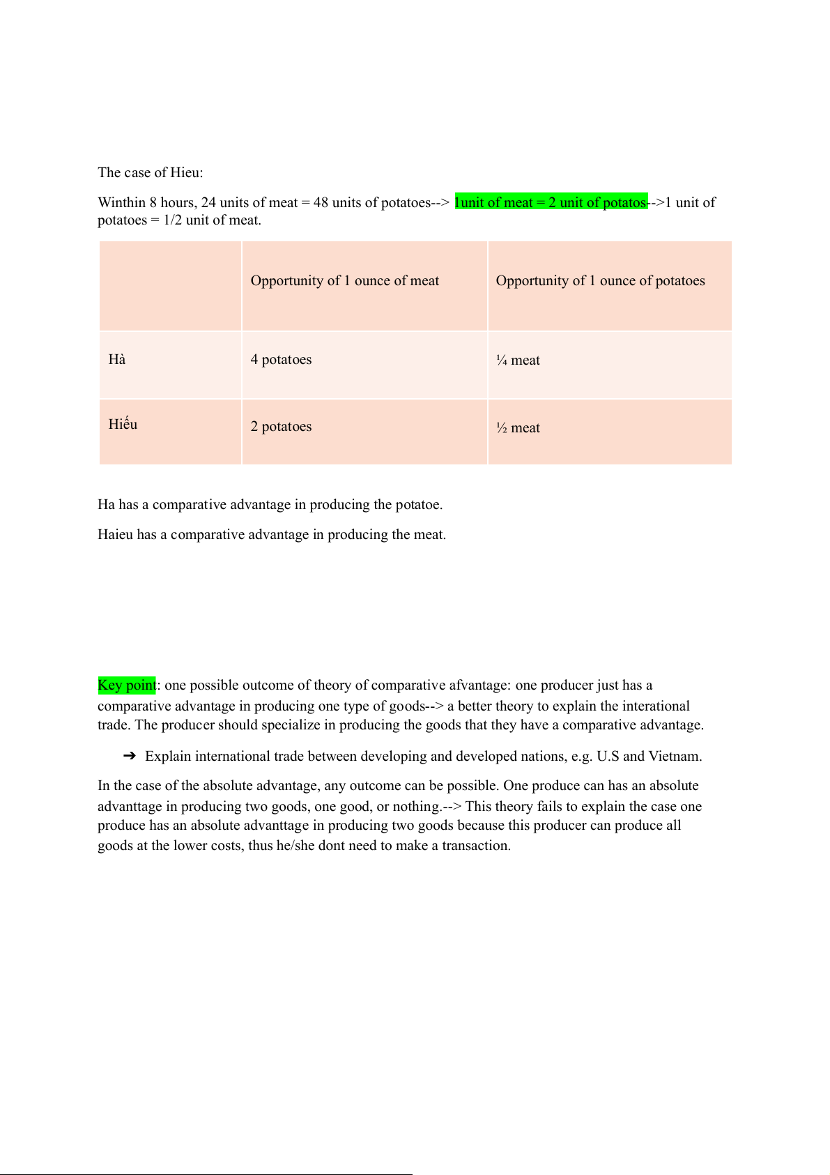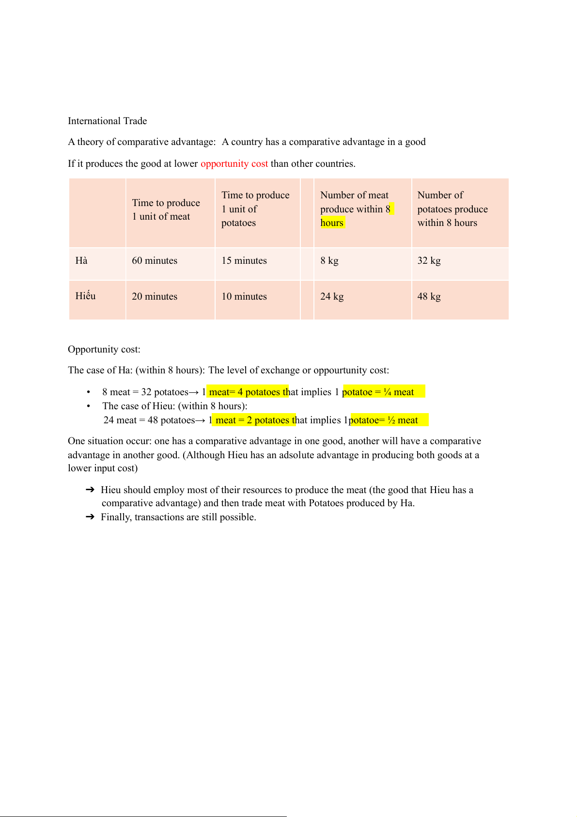 If it produces the good at lower opportunity cost than other countries. Time to produce Number of meat Number of Time to produce 1 unit of produce within 8 potatoes produce 1 unit of meat potatoes hours within 8 hours Hà 60 minutes 15 minutes 8 kg 32 kg Hiếu 20 minutes 10 minutes 24 kg 48 kg Opportunity cost: