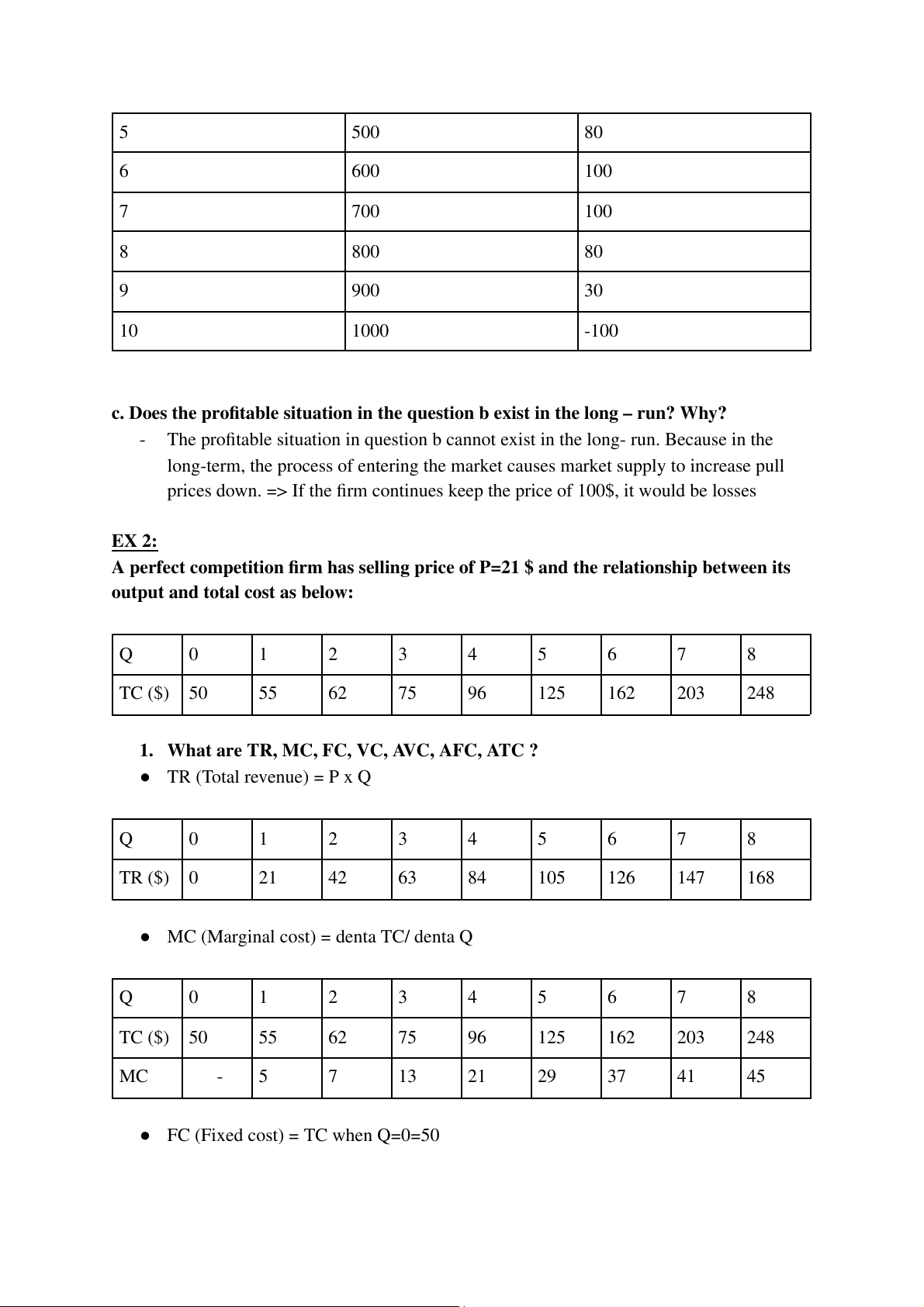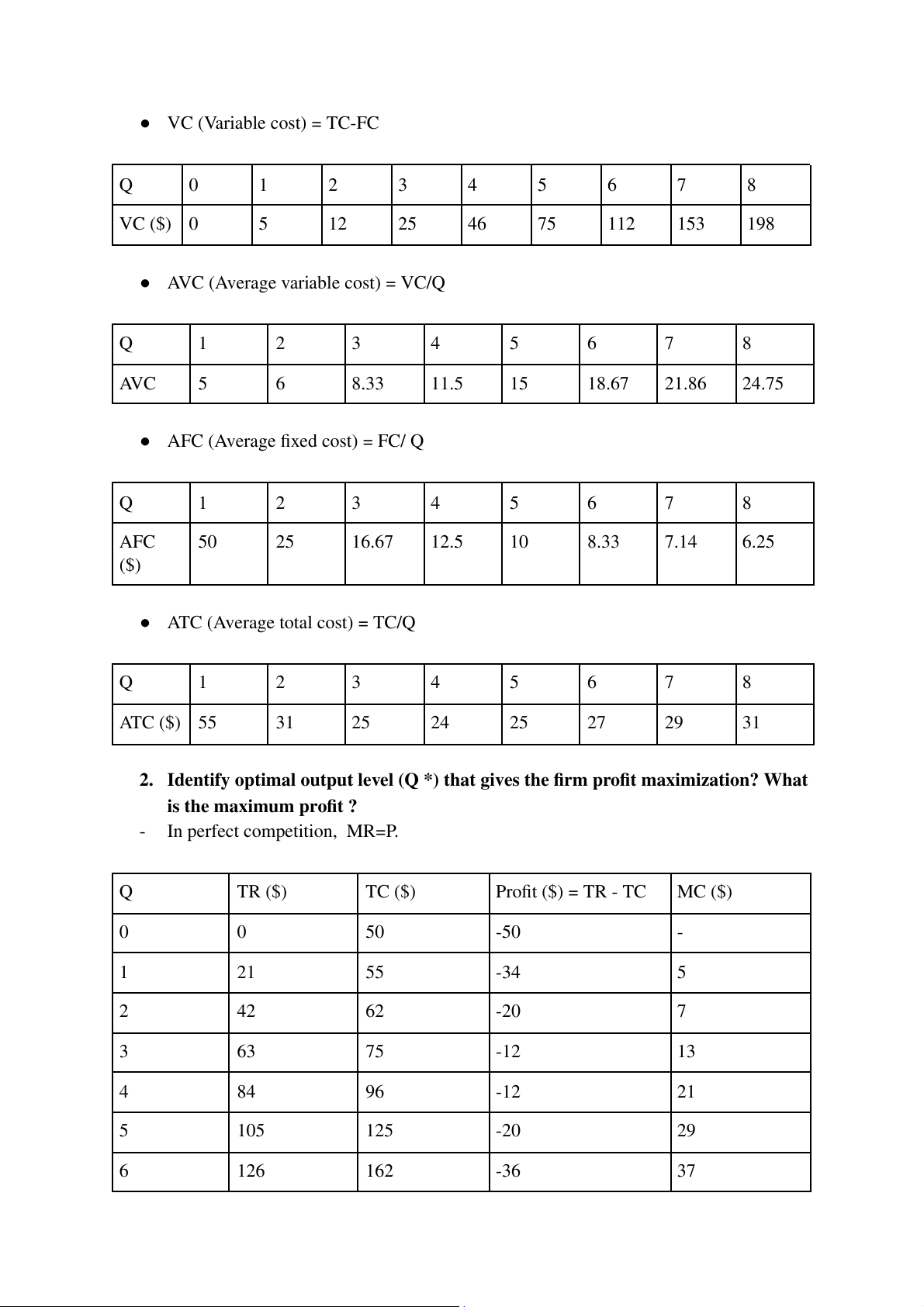 1. What are TR, MC, FC, VC, AVC, AFC, ATC ? ● TR (Total revenue) = P x Q Q 0 1 2 3 4 5 6 7 8 TR ($) 0 21 42 63 84 105 126 147 168