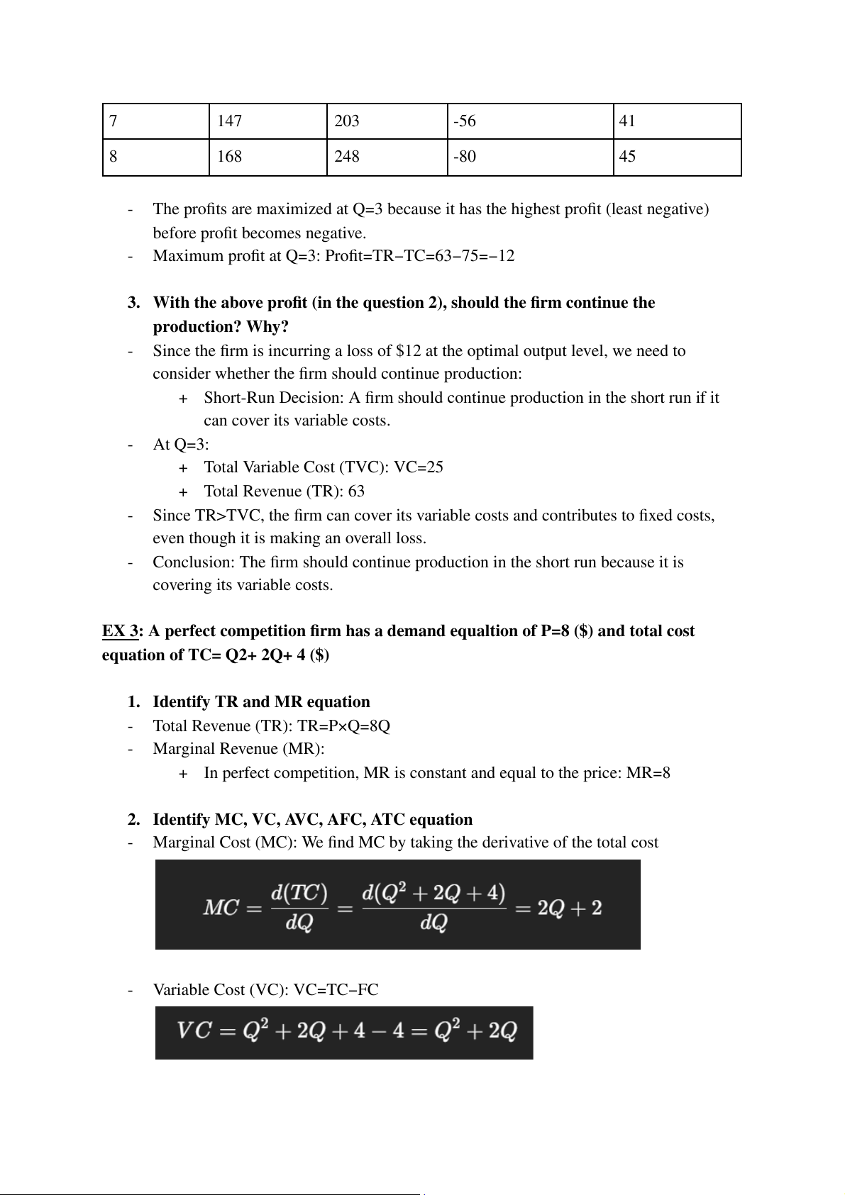 EX 3: A perfect competition firm has a demand equaltion of P=8 ($) and total cost