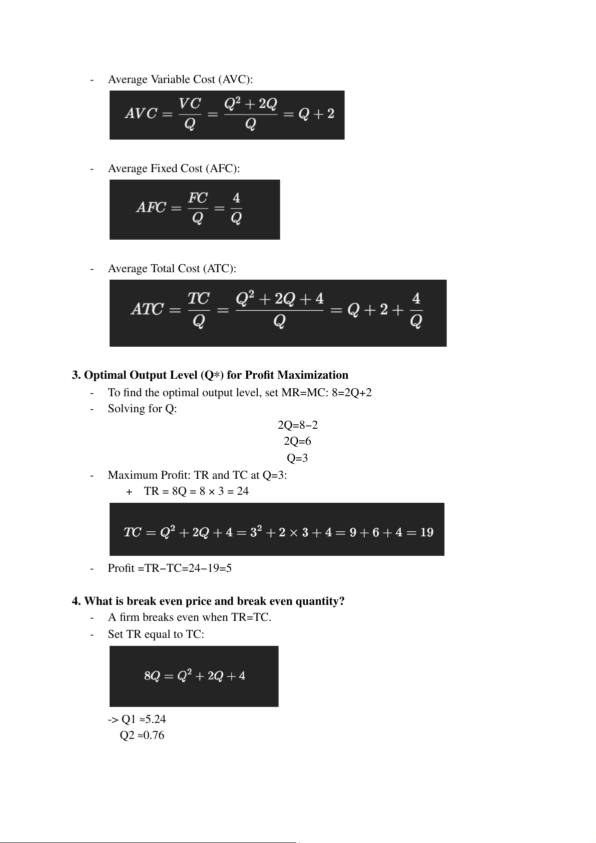 Marginal Cost (MC): We find MC by taking the derivative of the total cost - Variable Cost (VC): VC=TC−FC - Average Variable Cost (AVC): - Average Fixed Cost (AFC): - Average Total Cost (ATC):