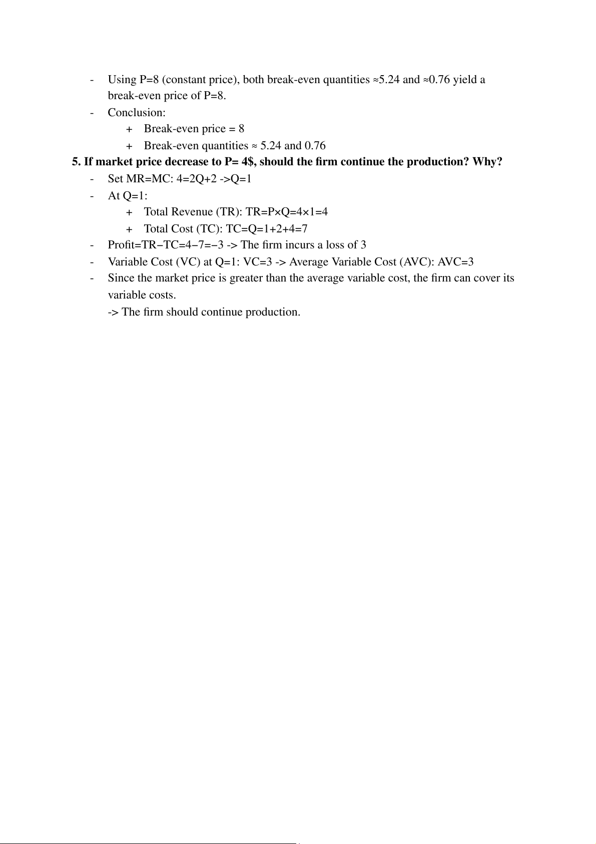 5. If market price decrease to P= 4$, should the firm continue the production? Why? - Set MR=MC: 4=2Q+2 ->Q=1 - At Q=1: