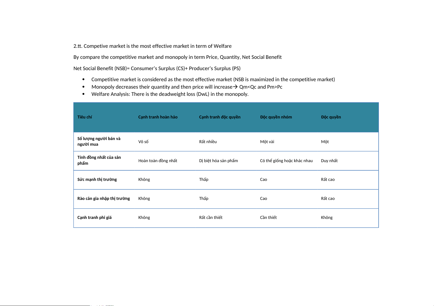 Welfare Analysis: There is the deadweight loss (DwL) in the monopoly. Tiêu chí