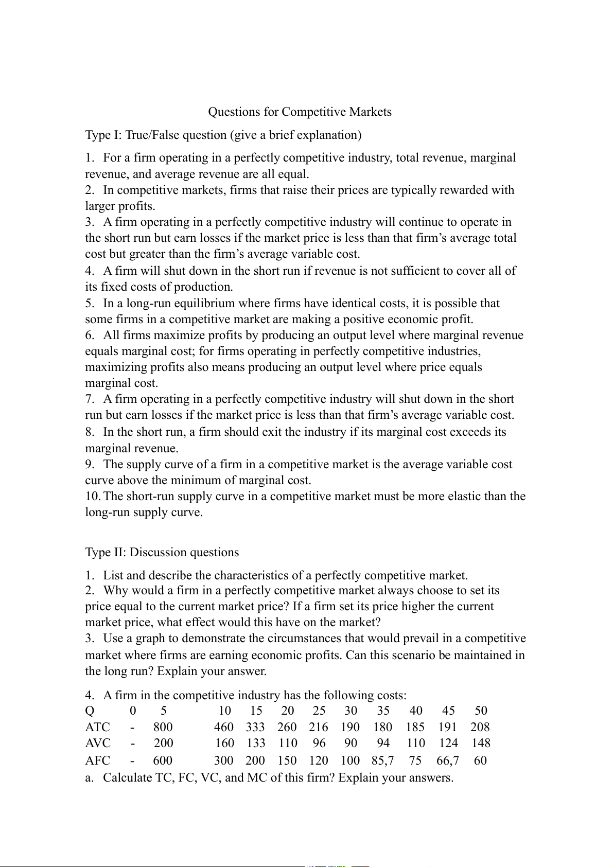 10. The short-run supply curve in a competitive market must be more elastic than the long-run supply curve. Type II: Discussion questions