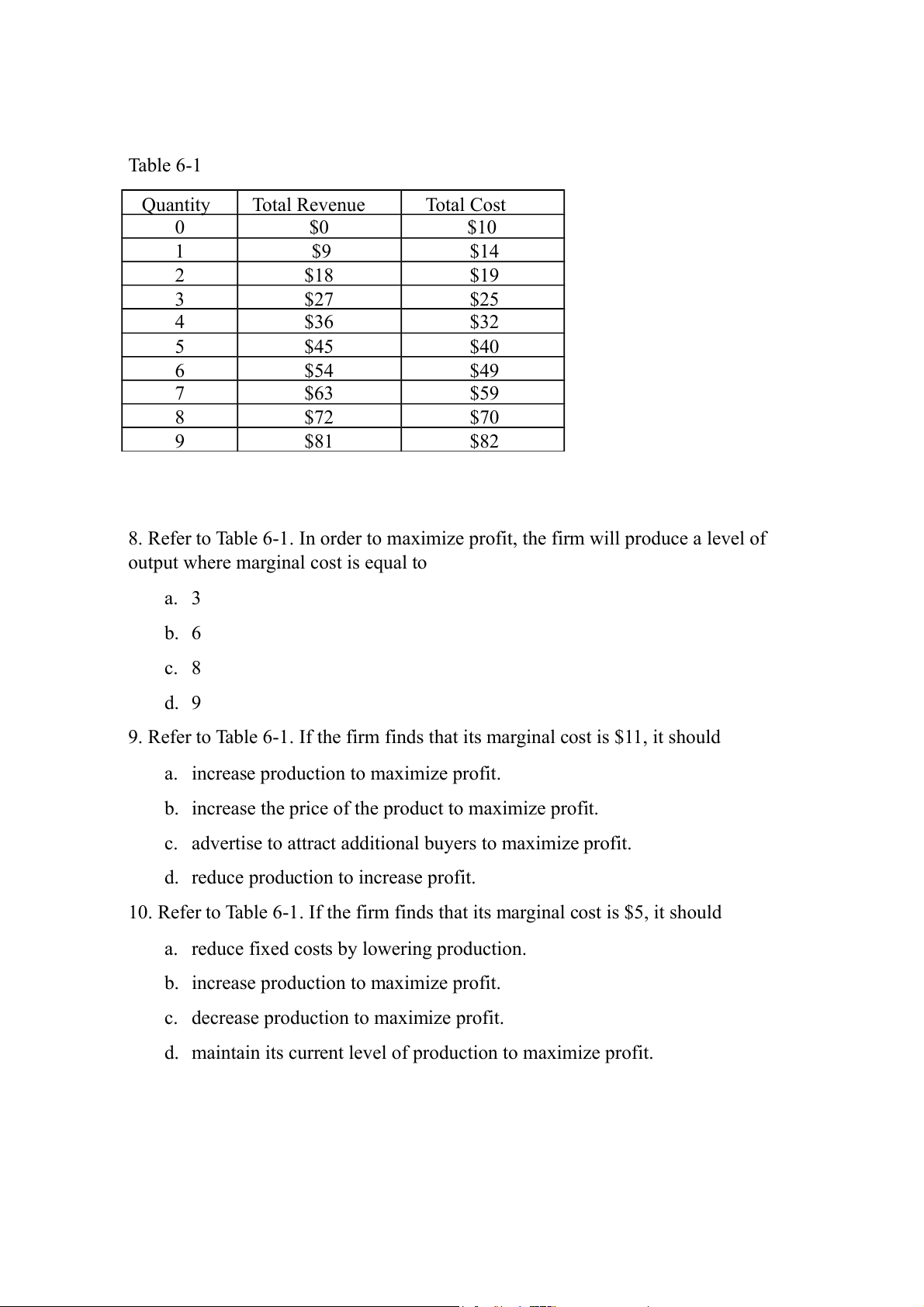 8. Refer to Table 6-1. In order to maximize profit, the firm will produce a level of