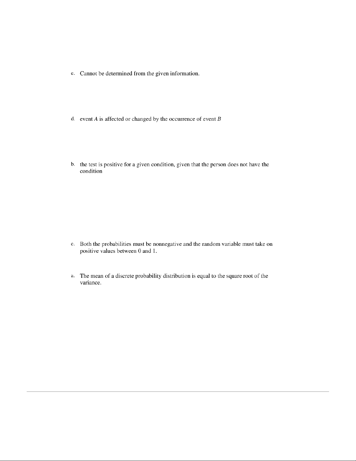 ____ 13. Two events A and B are said to be dependent if and only if: a. P(A) = P(B)