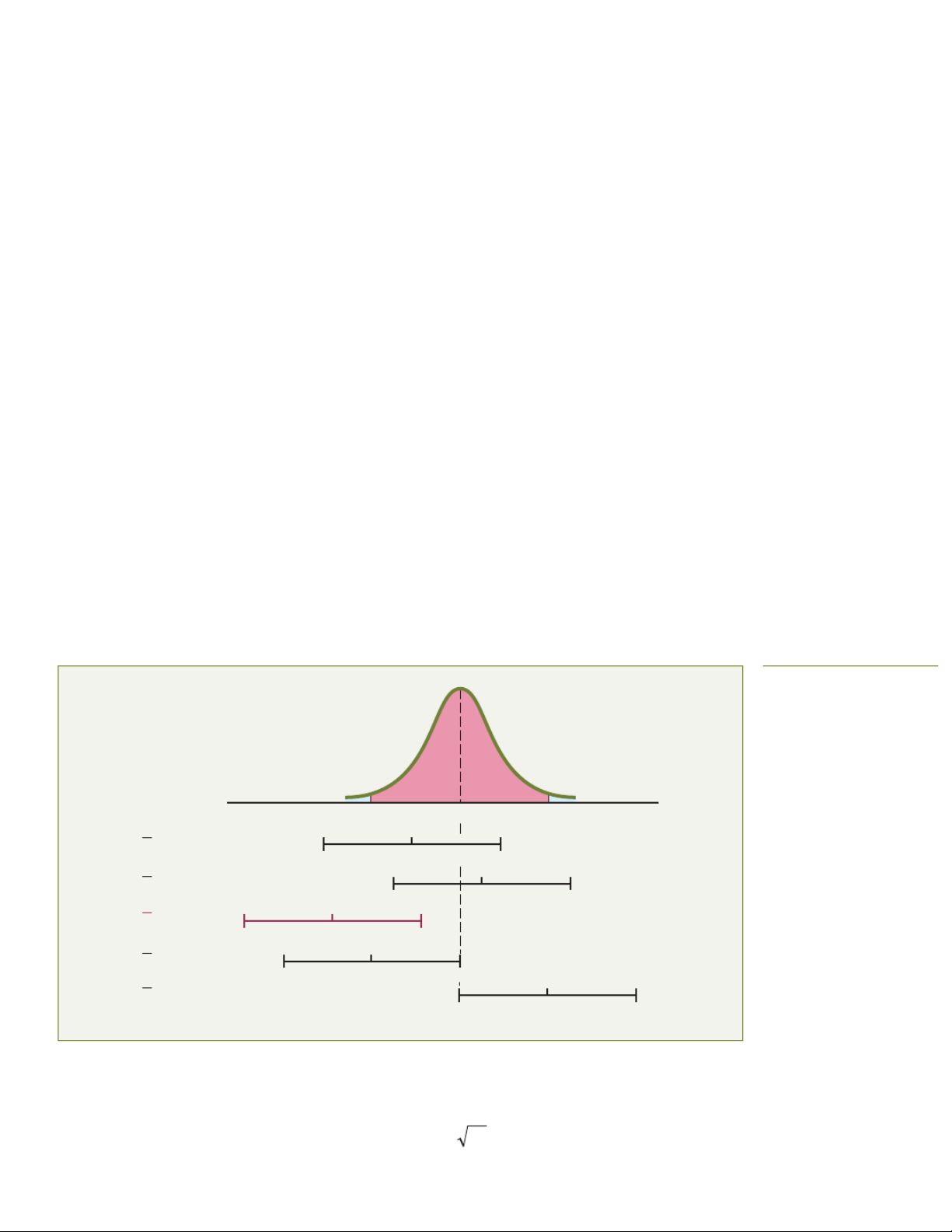 led to a correct statement about μ (see Figure 8.1). Figure 8.1 Confidence interval estimates for five different samples of n = 25 taken from a population where μ = 500 and σ = 15 494.12 505.88 500 X1 = 496.2 490.32 496.2 502.08 X2 = 501.6 495.72 501.6 507.48 X3 = 493.0 487.12 493.0 498.88 X4 = 494.12 488.24 494.12 500 X5 = 505.88 500 505.88 511.76