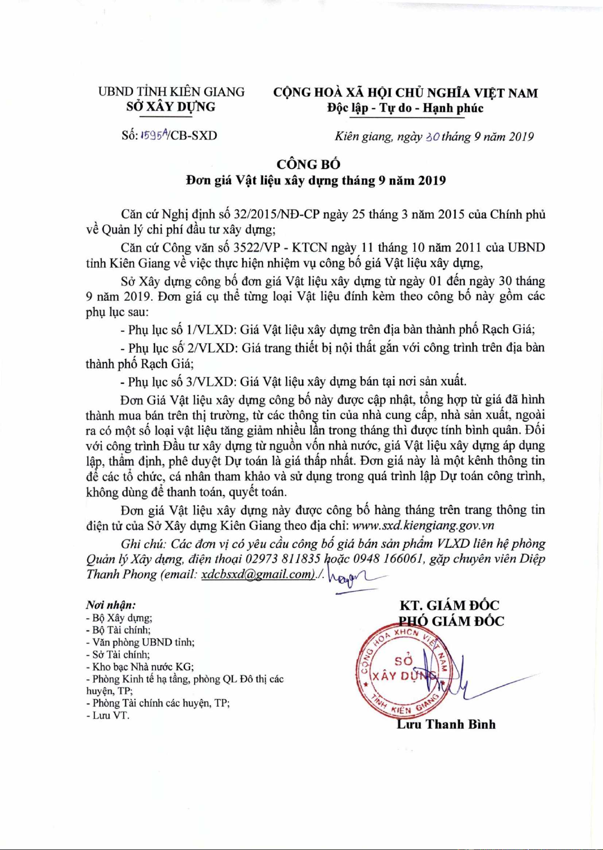 tinh Kien Giang ye viec thirc hien nhiem vv cong bo gia VAt lieu xay dung,