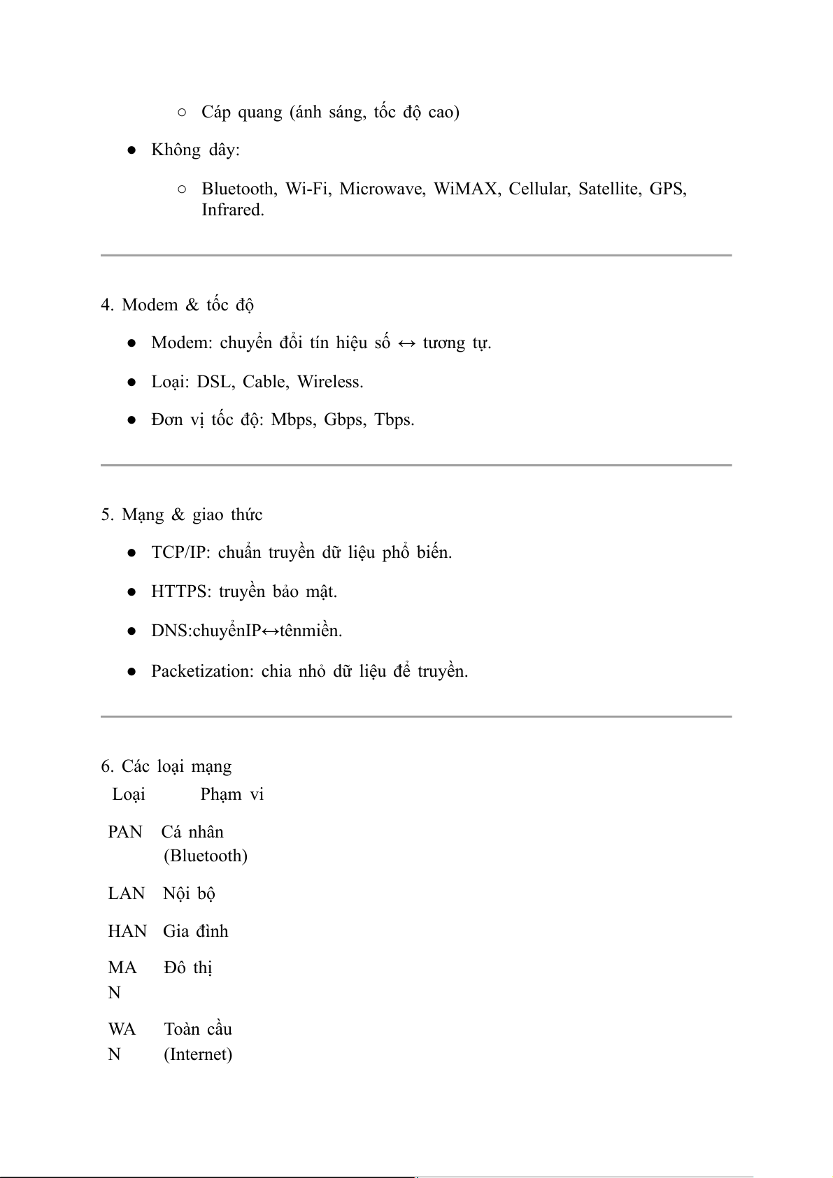 📘 Tóm tắt nhanh: Mạng = kết nối + truyền dữ liệu + bảo mật; gồm LAN, WAN,