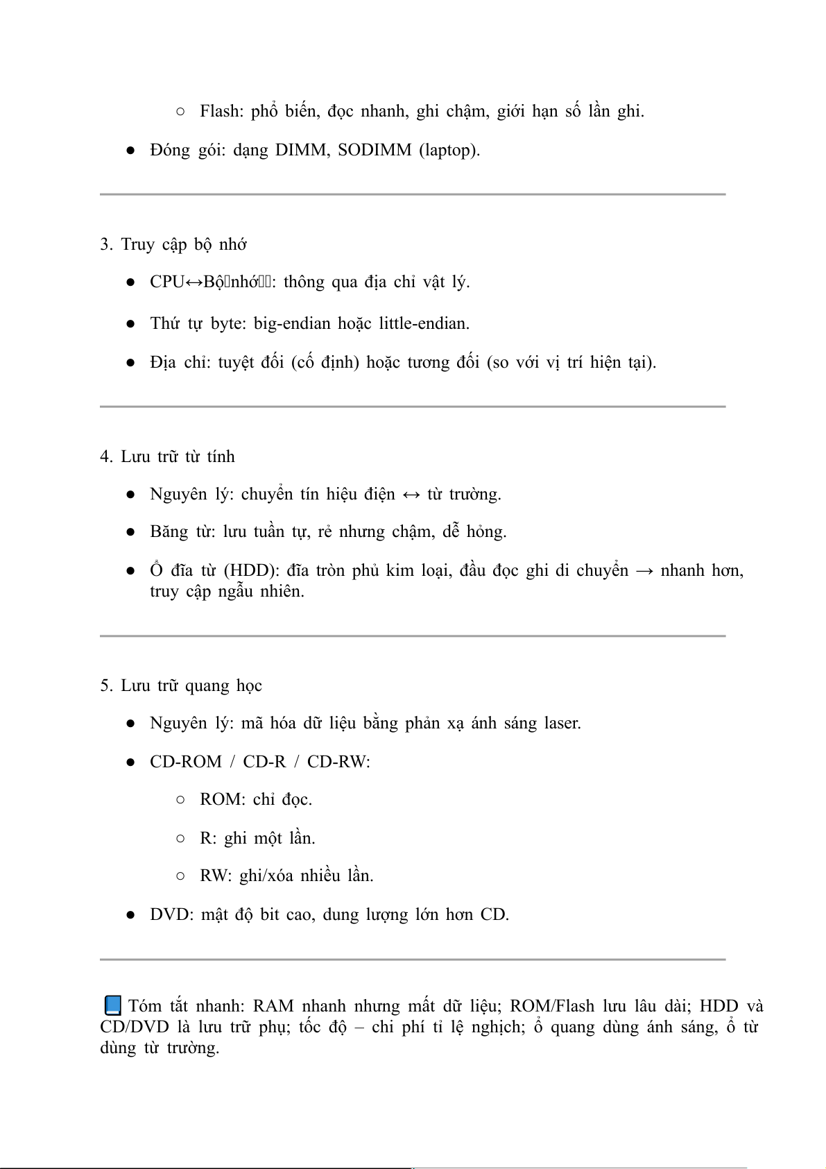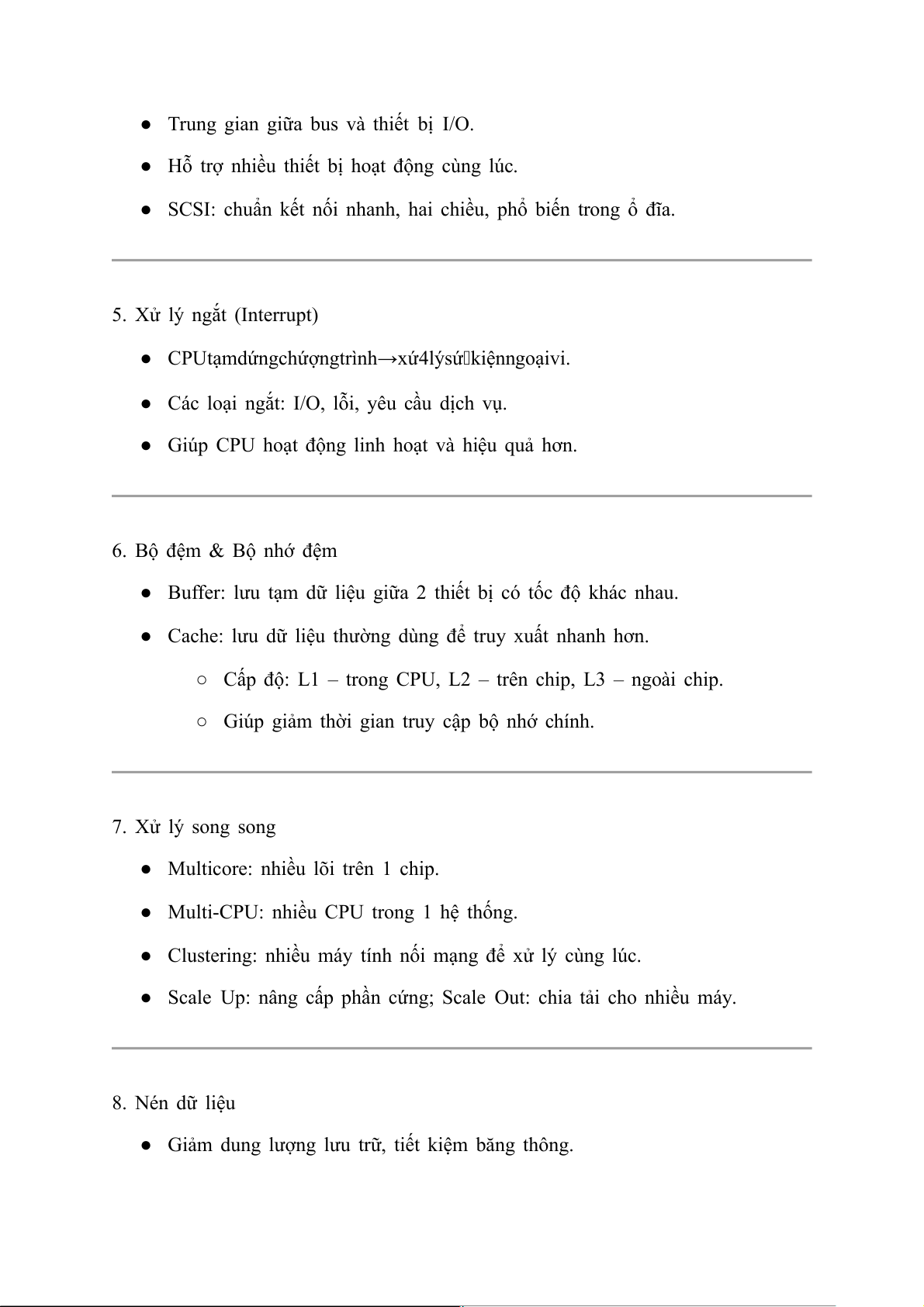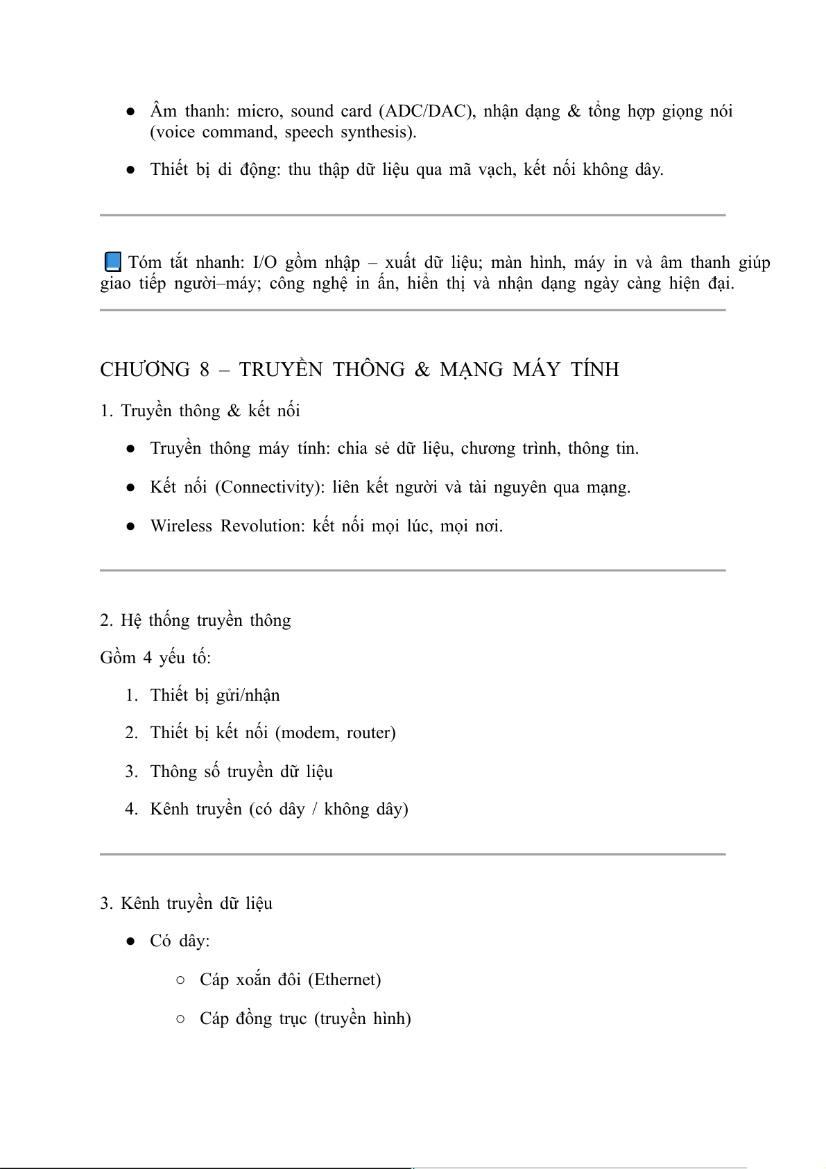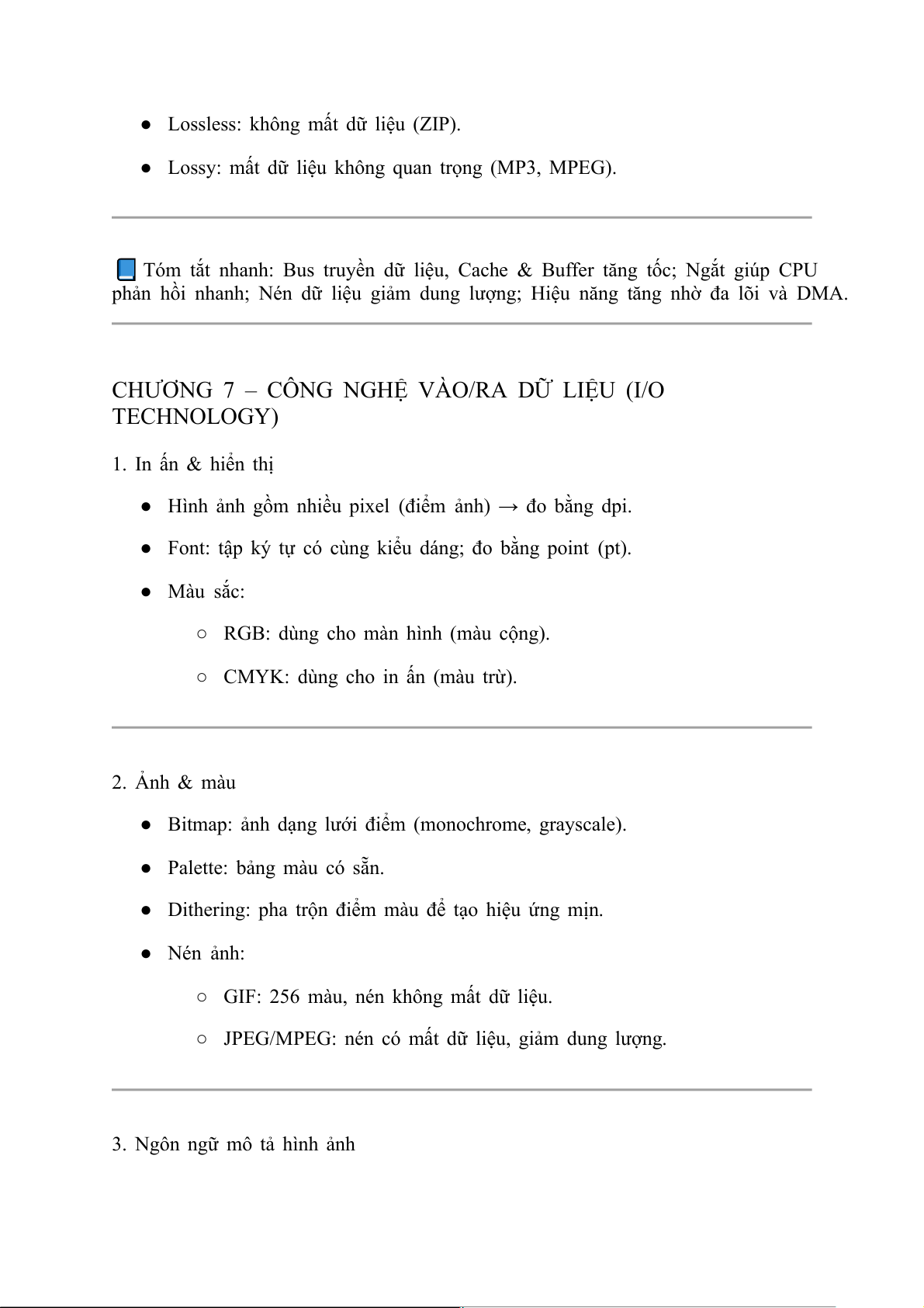 📘 Tóm tắt nhanh: I/O gồm nhập – xuất dữ liệu; màn hình, máy in và âm thanh giúp