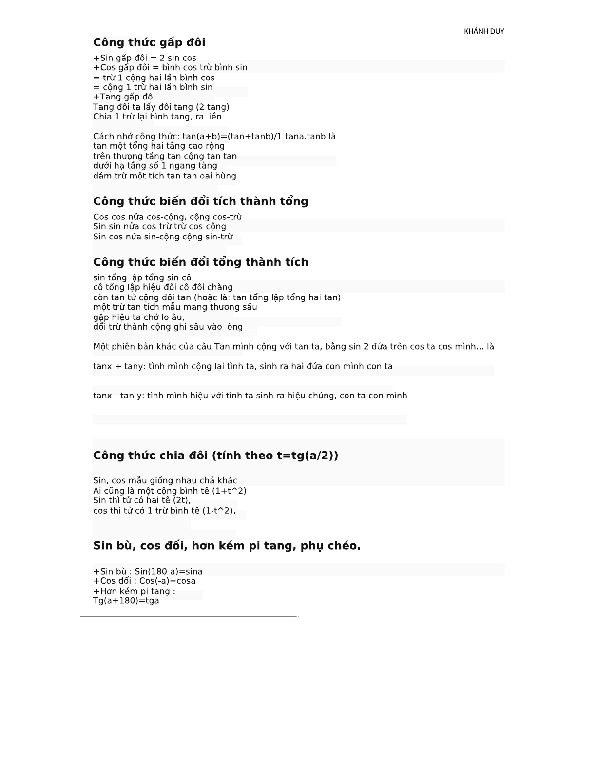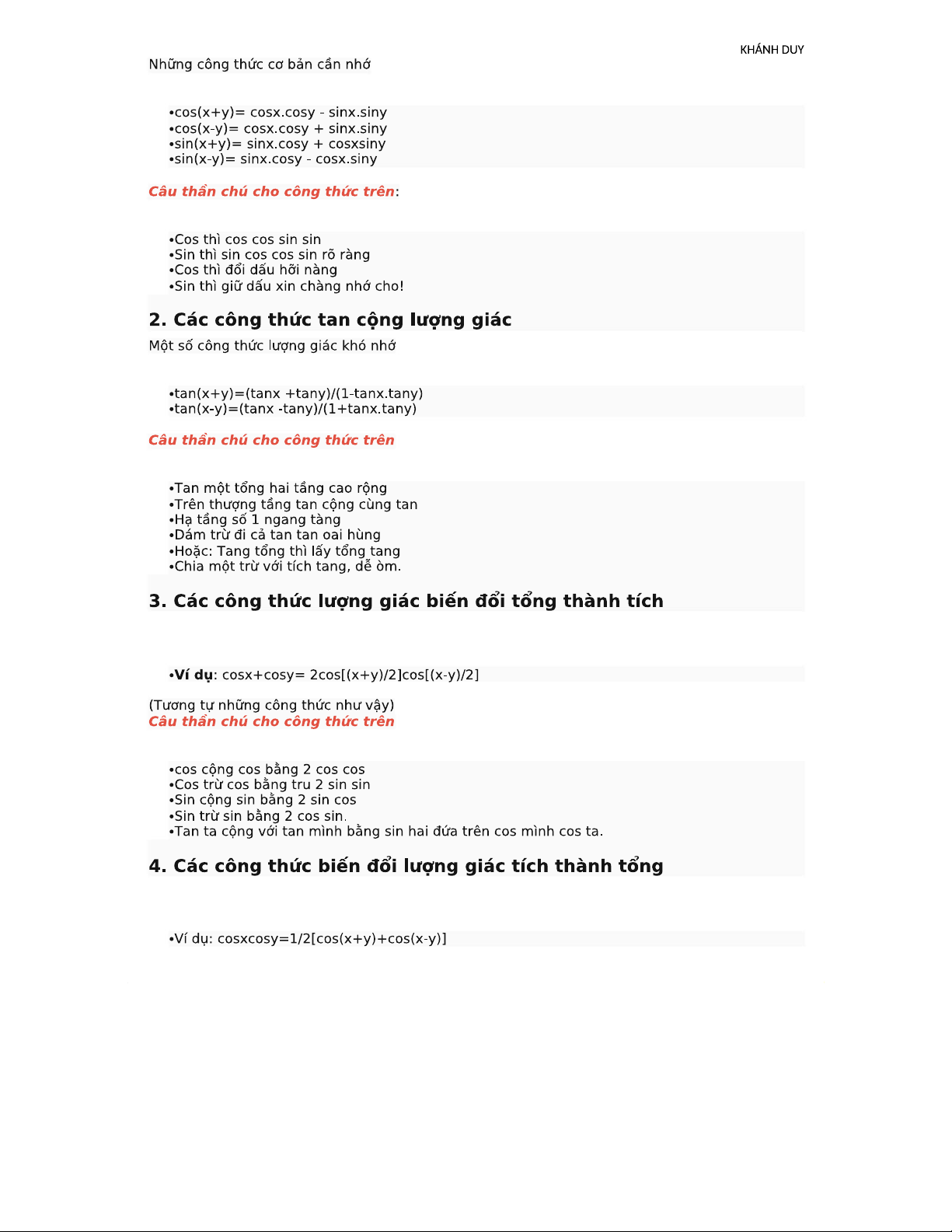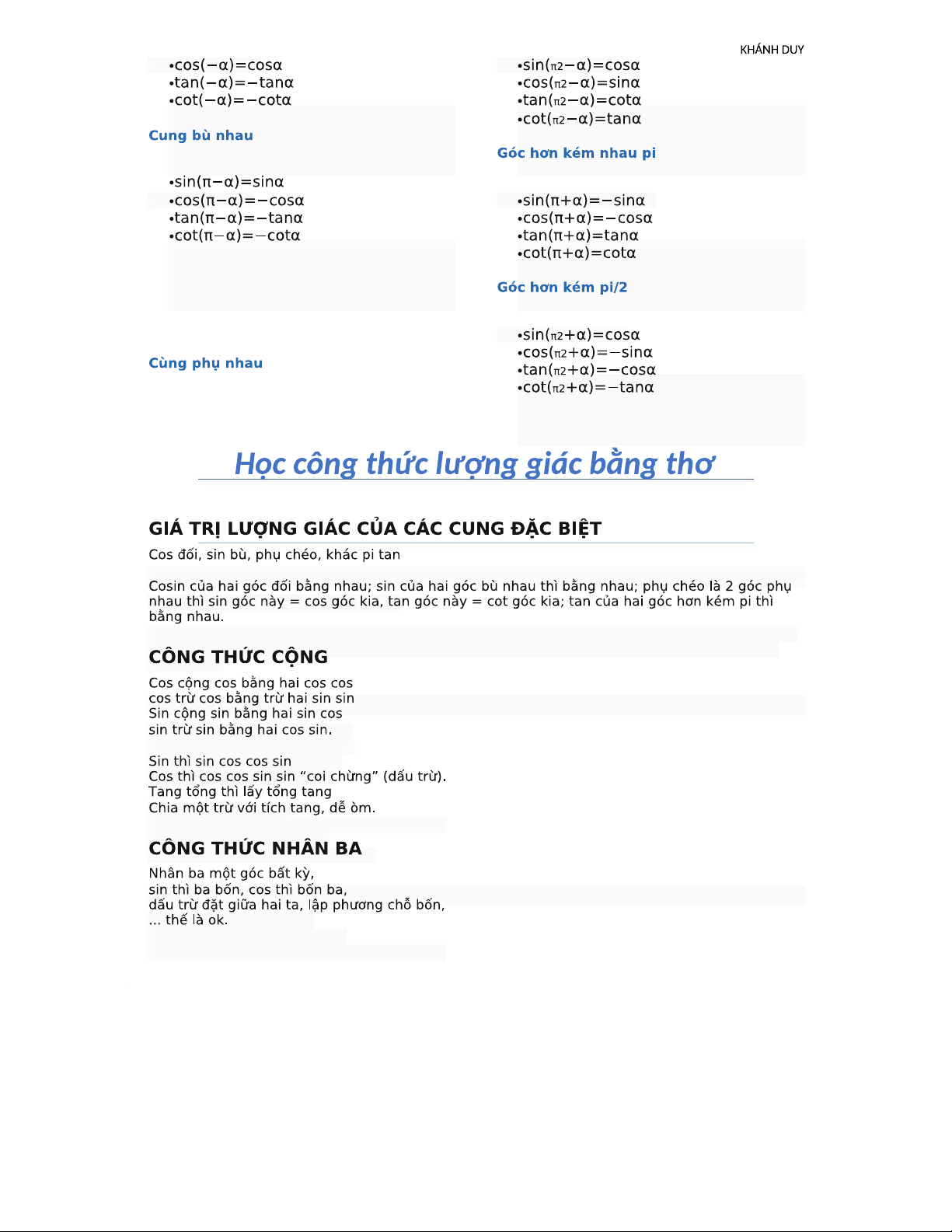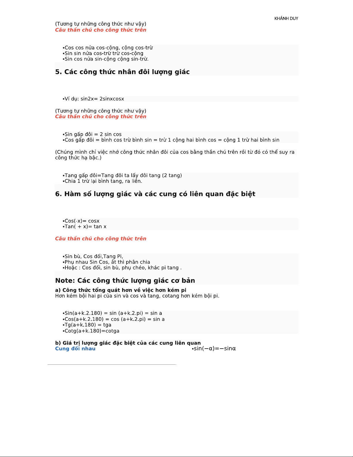 CÔNG THỨC LƯỢNG GIÁC CƠ BẢN VÀ CÁC CÔNG THỨC QUAN TRỌNG KÈM HỌC