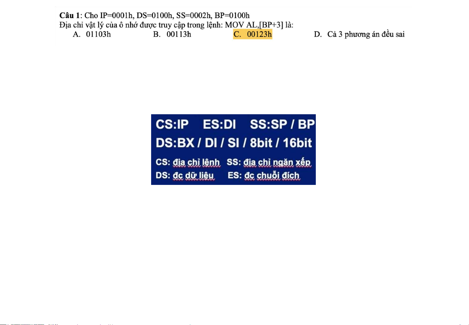 [ BP + 3 ] => thanh ghi phụ BP ( tra bảng trên sẽ thấy SS : BP ) , chỉ số dịch = 3 Địa chỉ vật lý = SS *01 H + BP + 3 = 0002H*01H + 0100H + 3 = 00020H + 0100H + 3 = 00123H lOMoAR cPSD| 61554479 © DHBK 2005