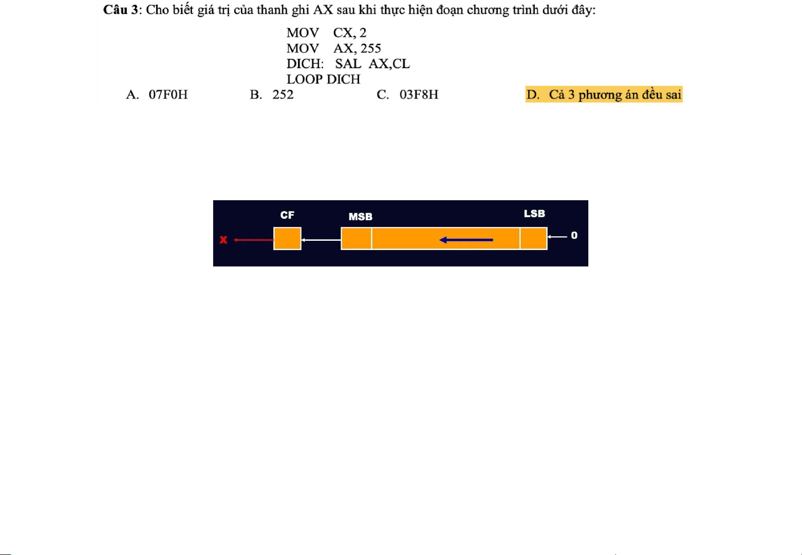 Dịch trái 0000 0000 1111 1111 đi 2 bit Vậy AX =