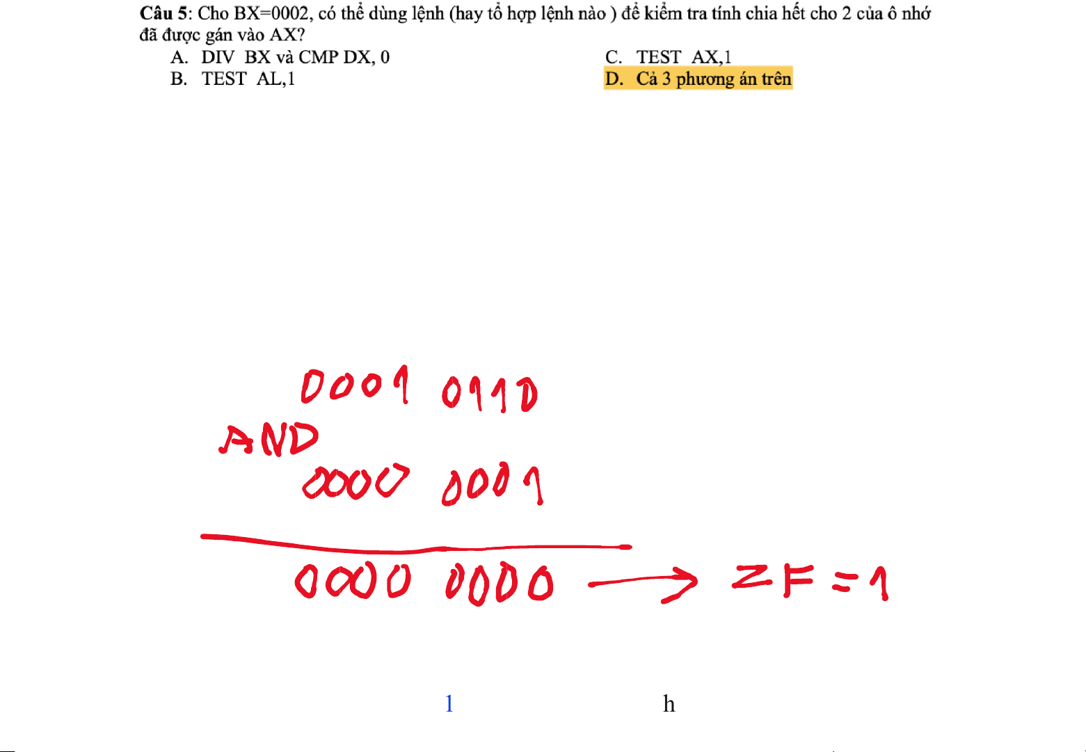 TEST AX, 1 giống y hệt phép AND AX, 1 nhưng kết quả sẽ không được lưu vào đâu mà chỉ