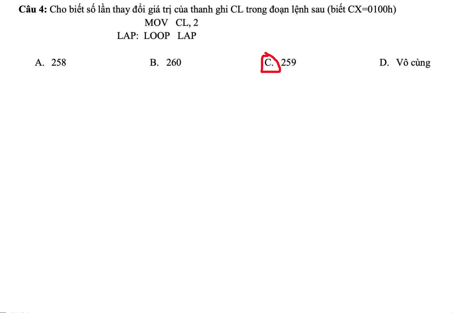 MOV CL, 2 => CL = 2 => CX = 0102h = 258 (CX thay đổi giá trị 1 lần )