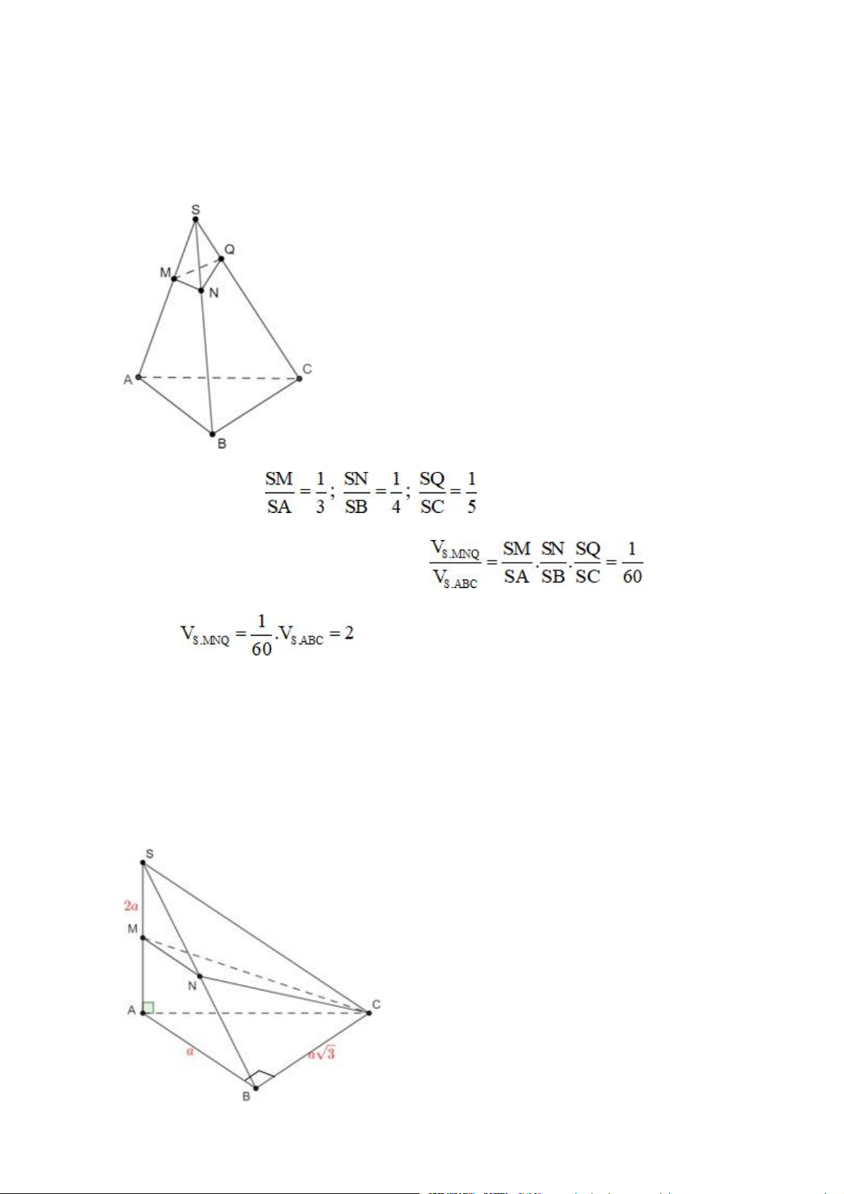 lượt lấy M, N, Q sao cho: MA = 2SM; NB = 3SN và QC = 4SQ. Tính thể tích khối chóp S.MNQ? Lời giải: Từ giả thiết ta có: